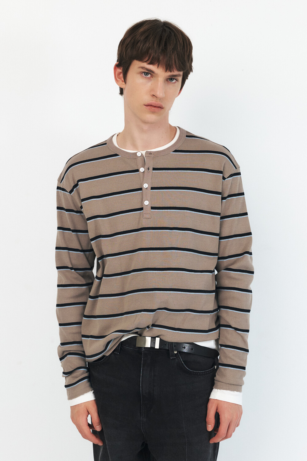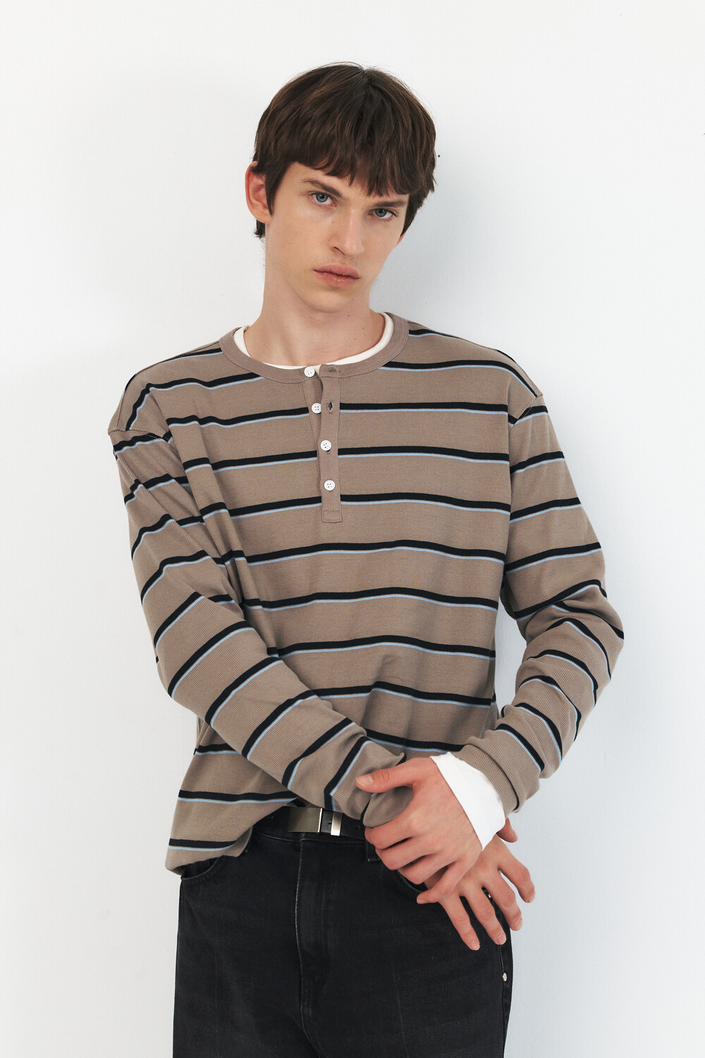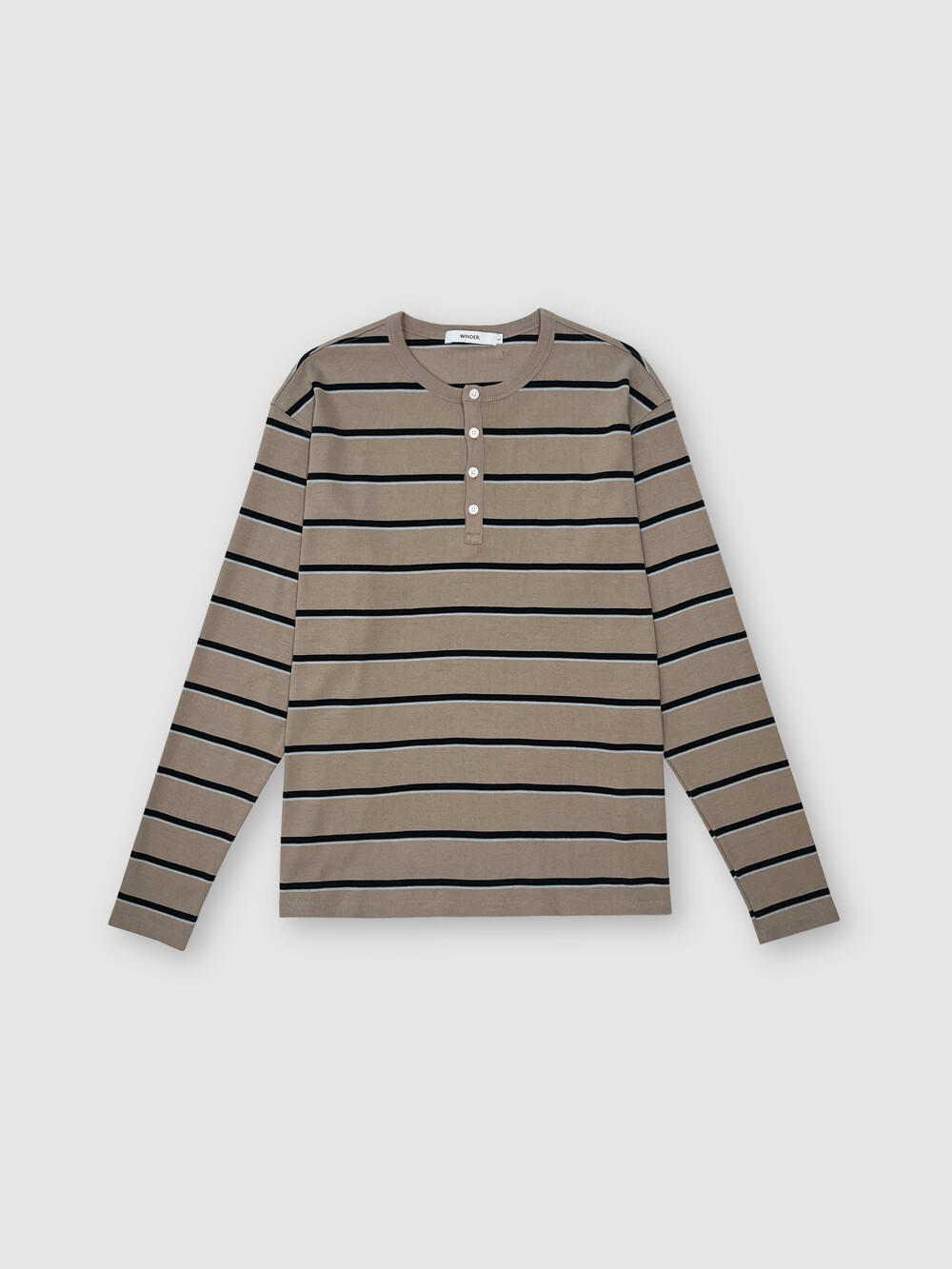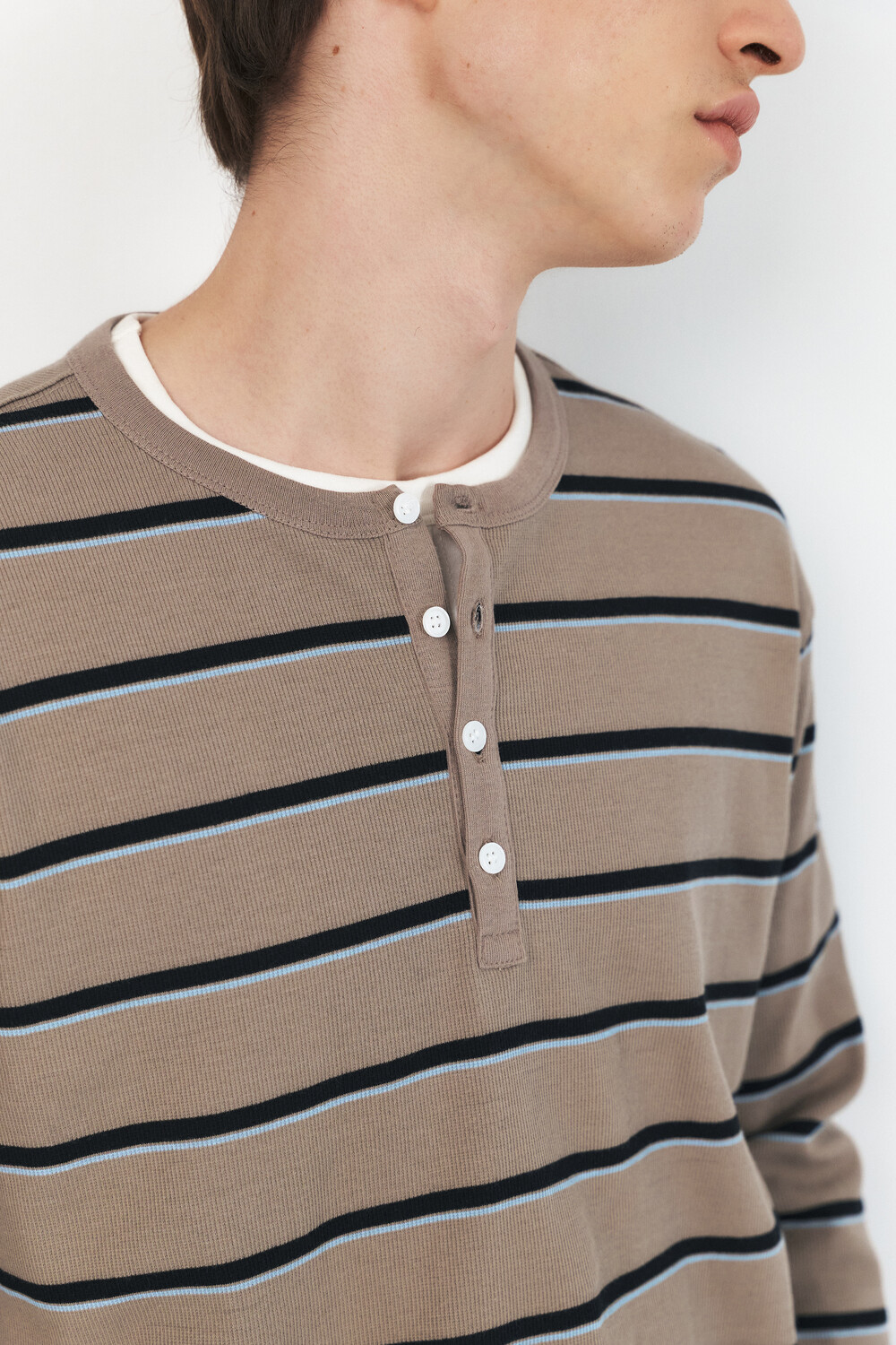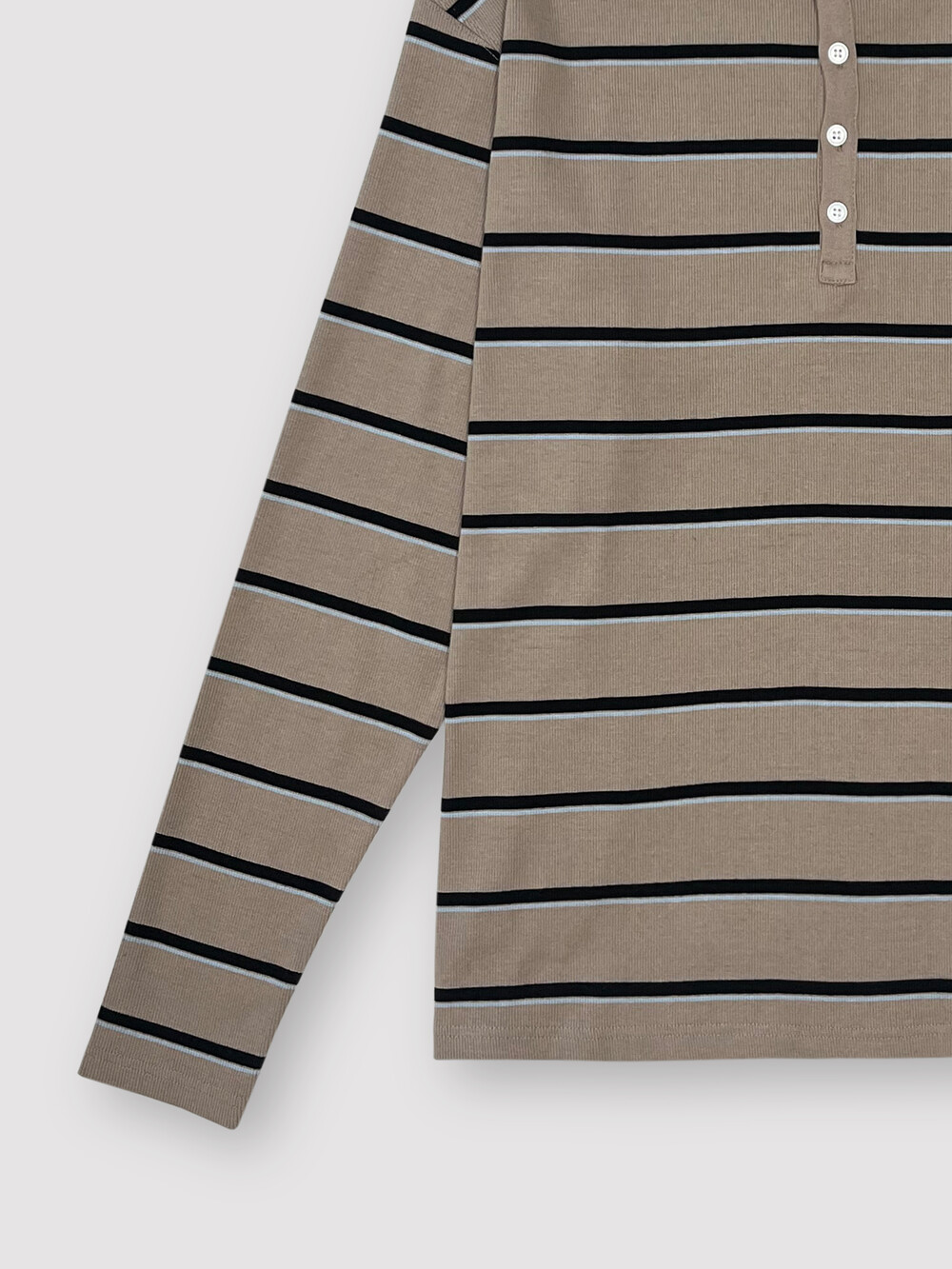 STRIPED COTTON HENLEY NECK TOP - TAUPE BEIGE