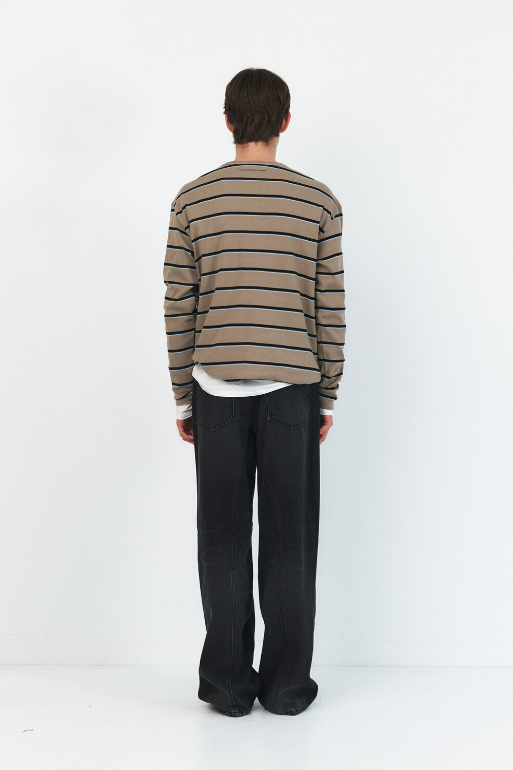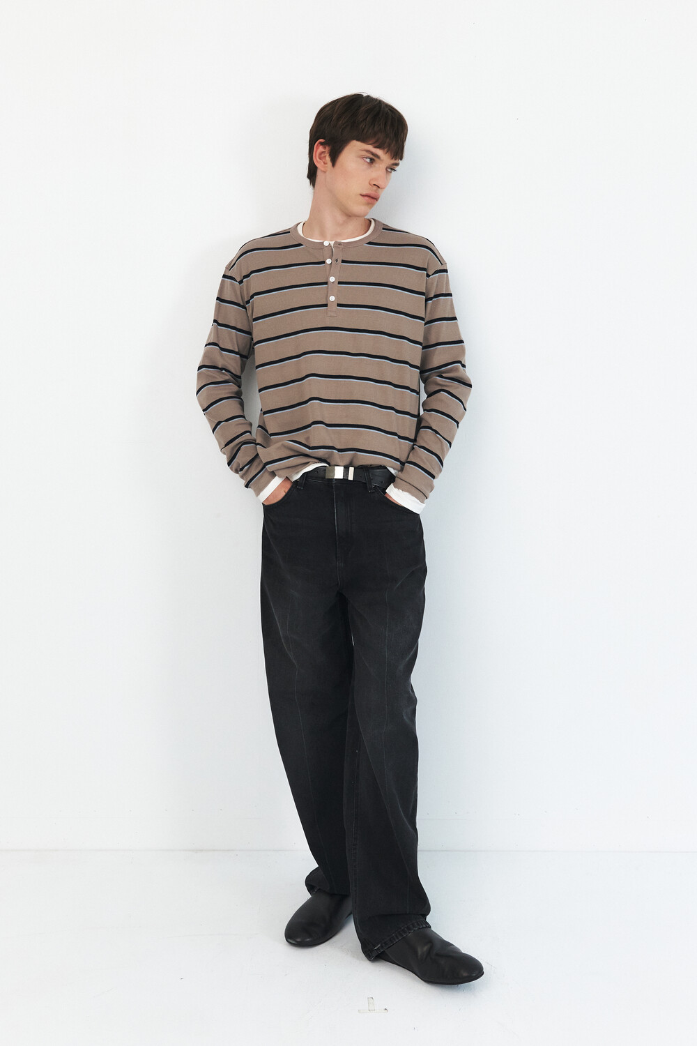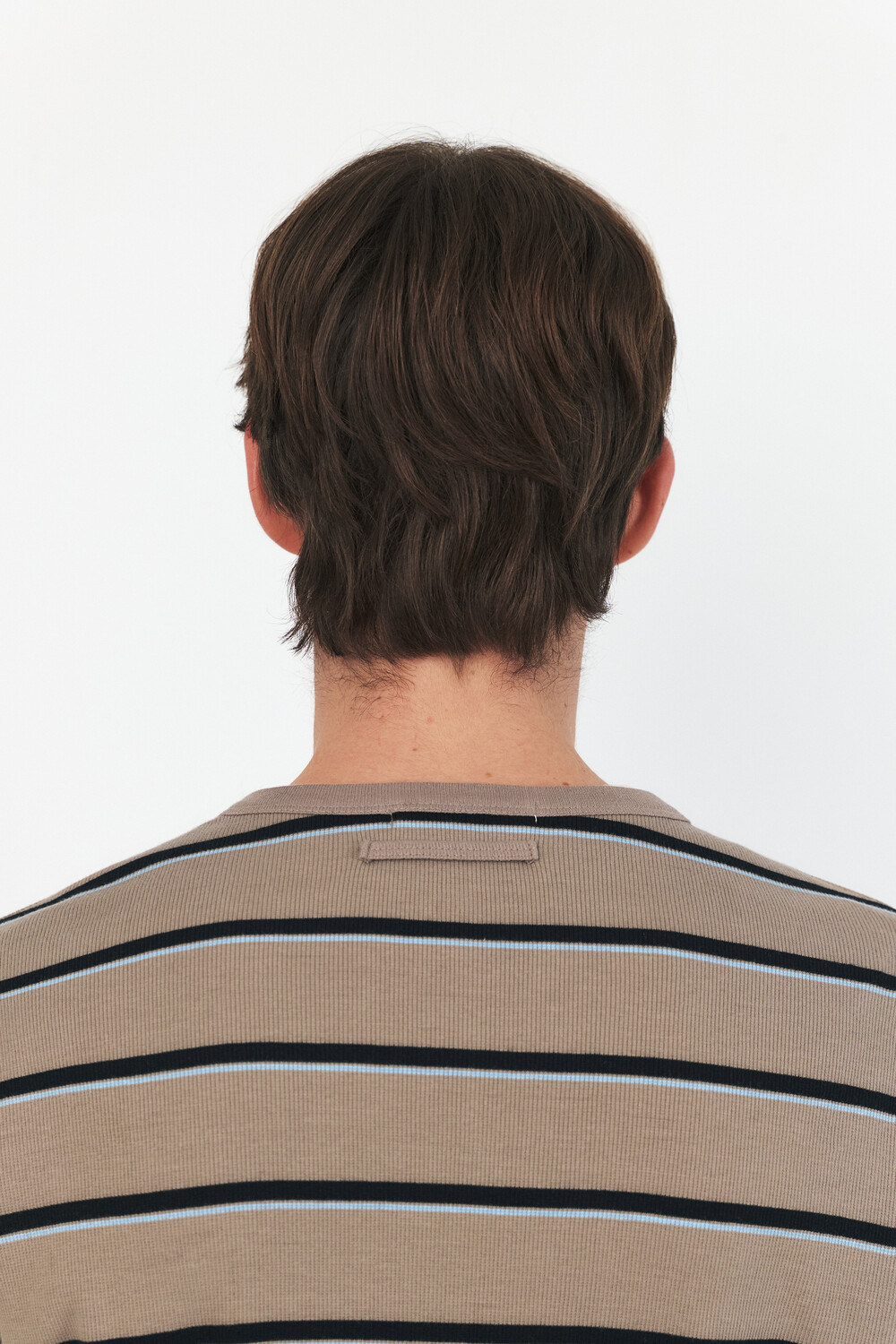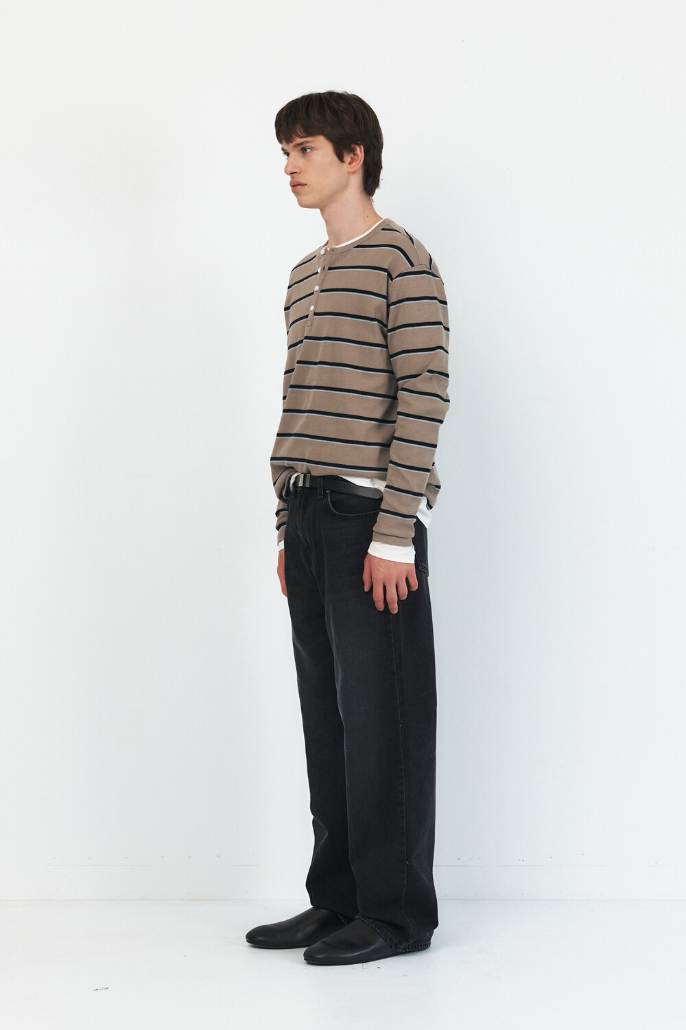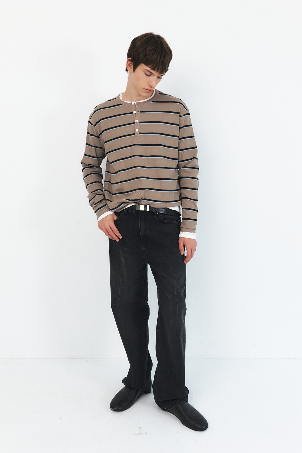 STRIPED COTTON HENLEY NECK TOP - TAUPE BEIGE