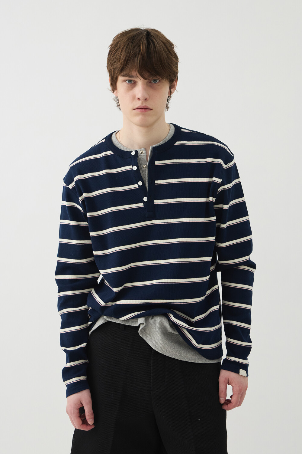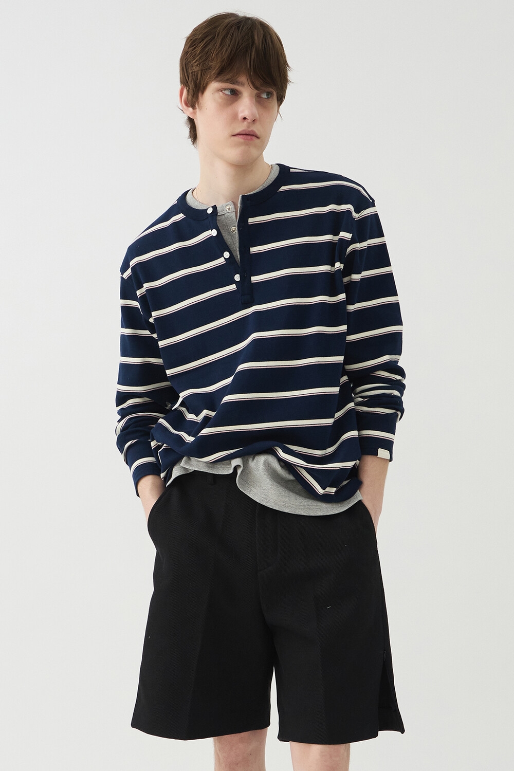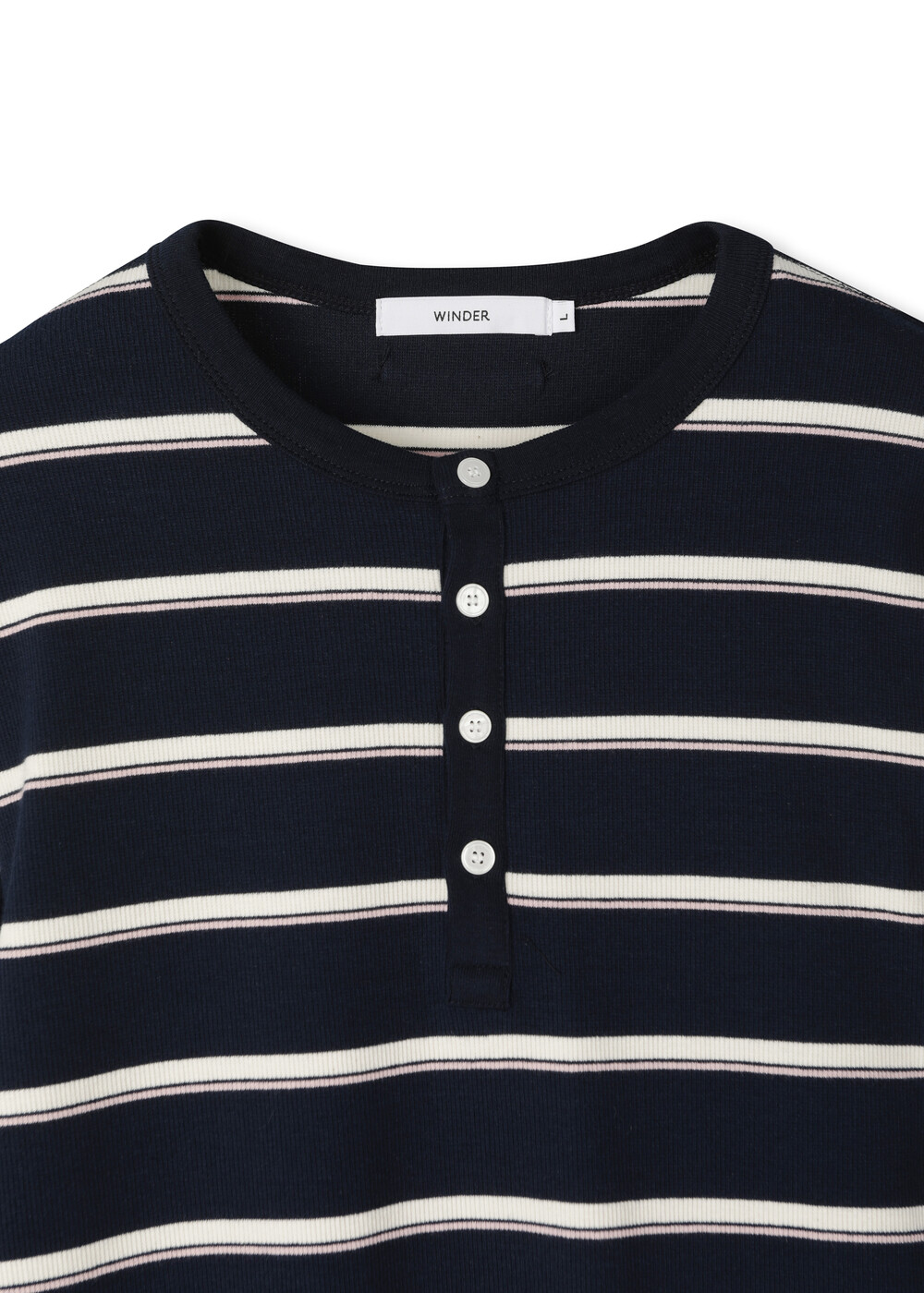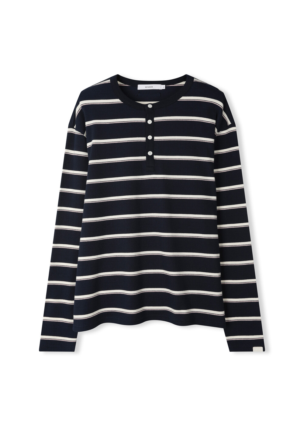 -안정감 있는 스트라이프 소재로 제작된 클래식 헨리넥 져지 탑