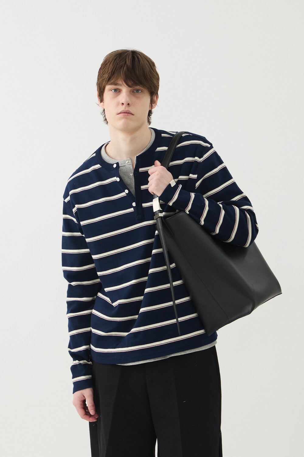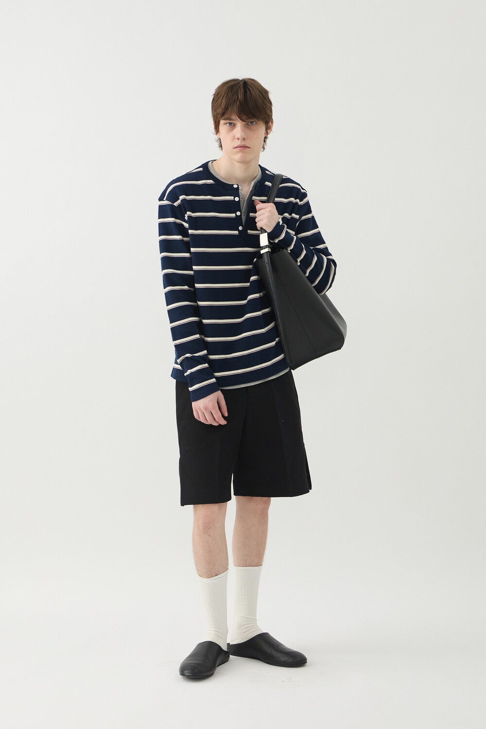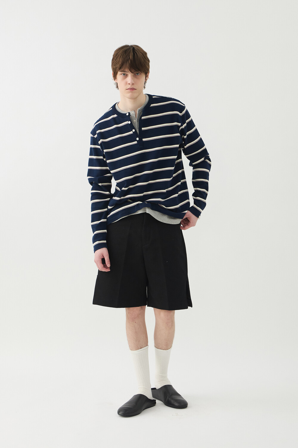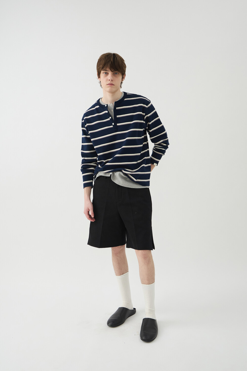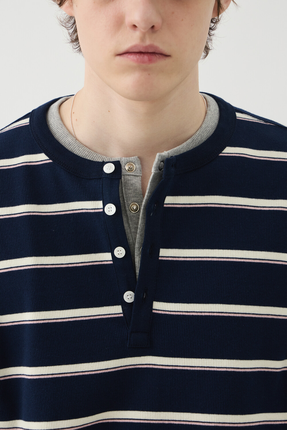 -안정감 있는 스트라이프 소재로 제작된 클래식 헨리넥 져지 탑