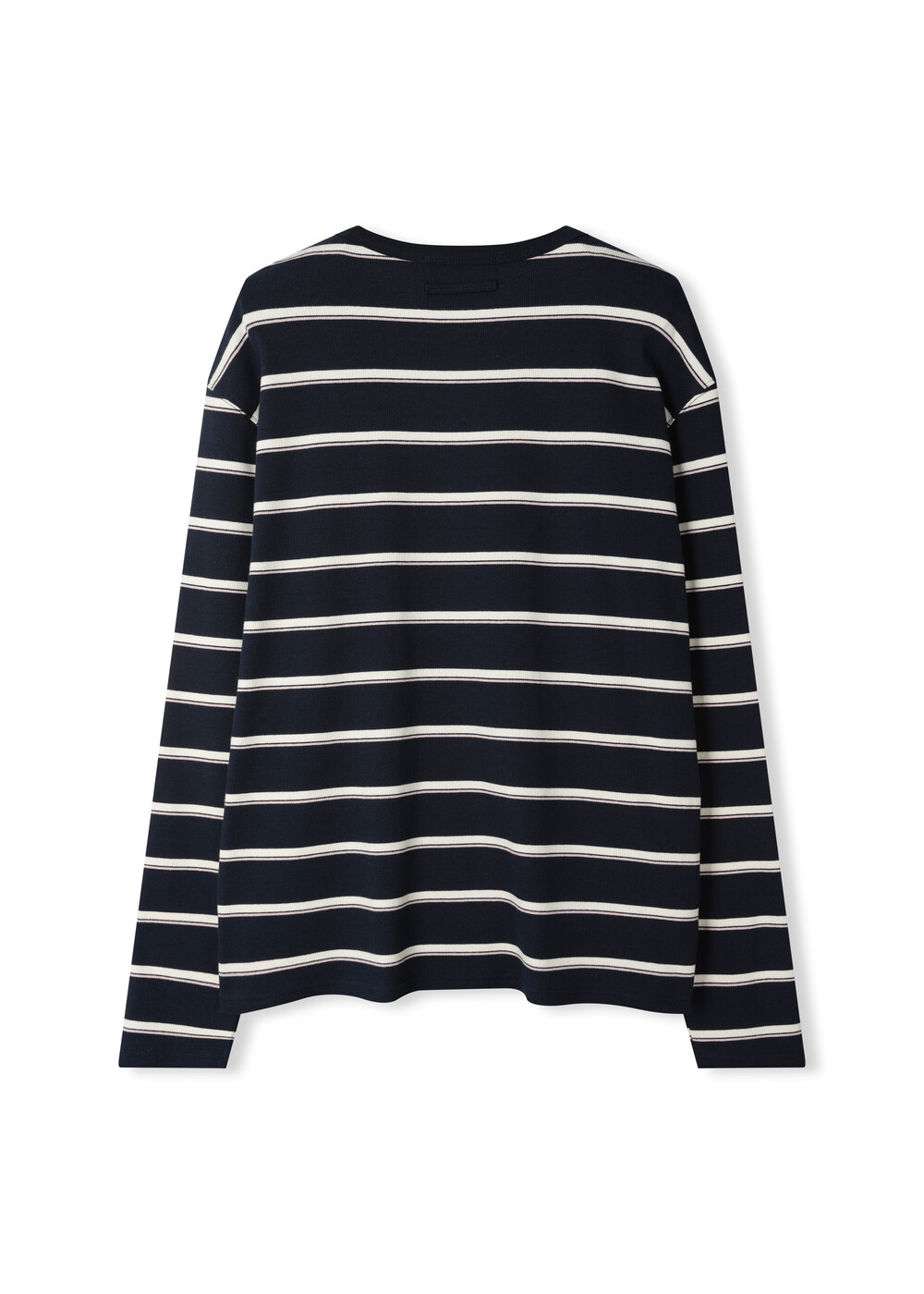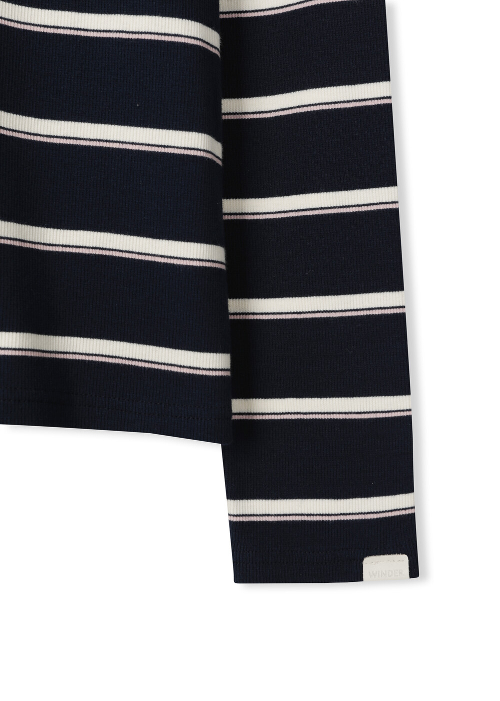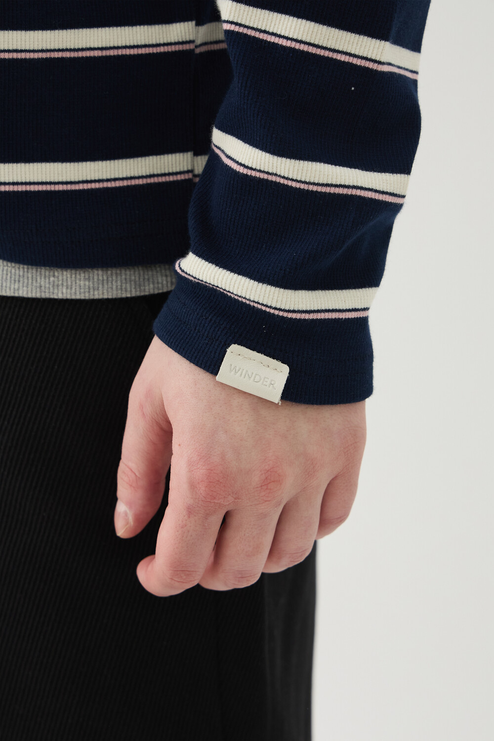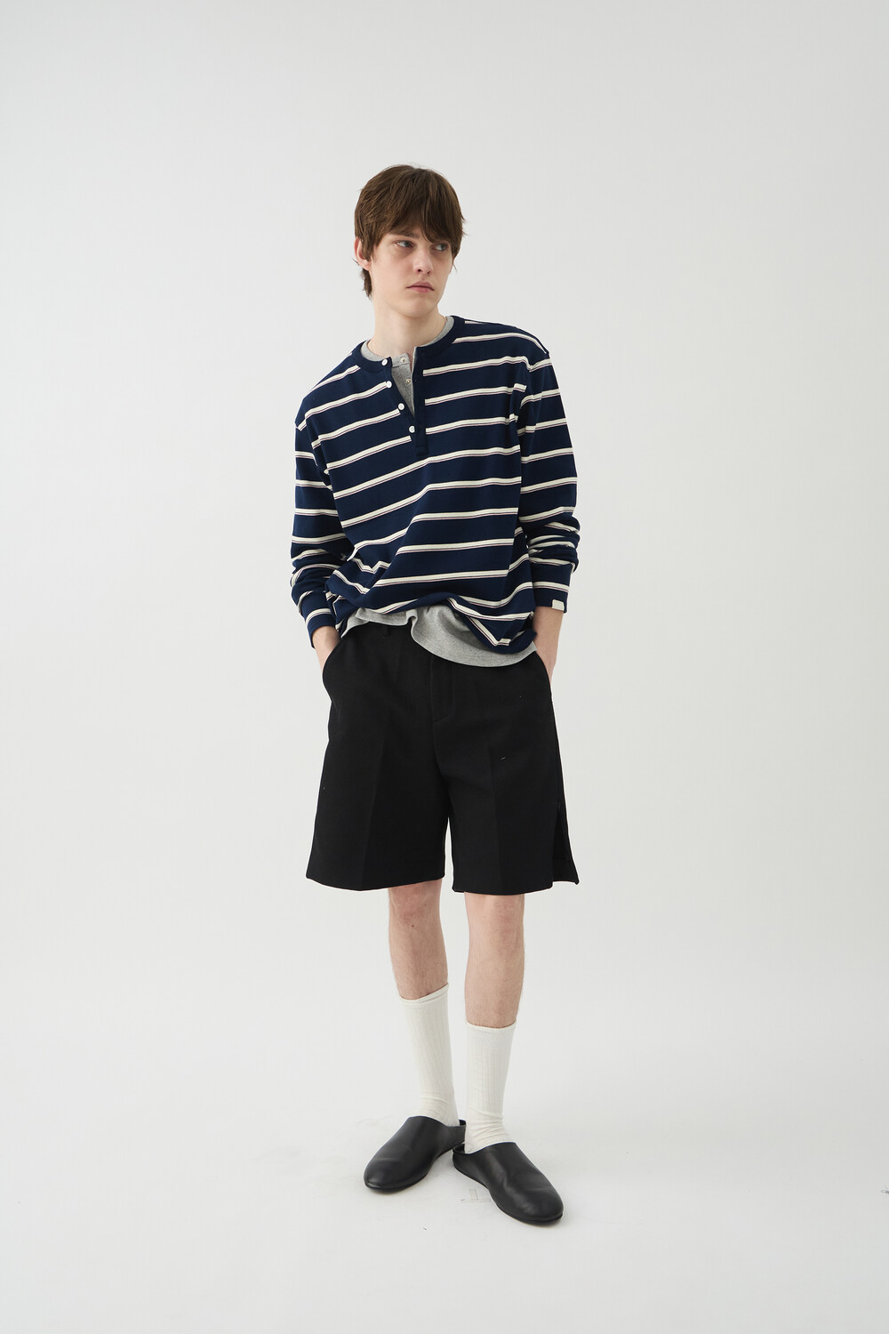 -안정감 있는 스트라이프 소재로 제작된 클래식 헨리넥 져지 탑