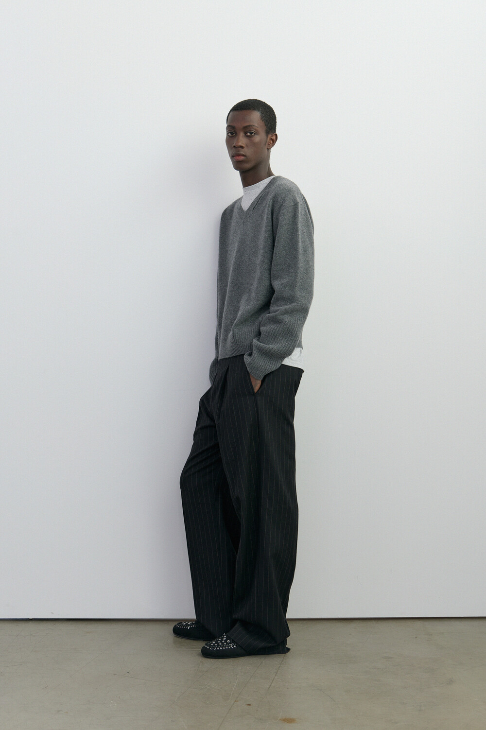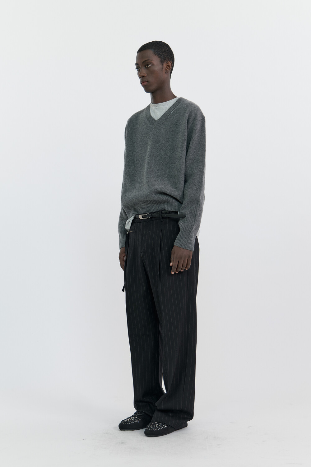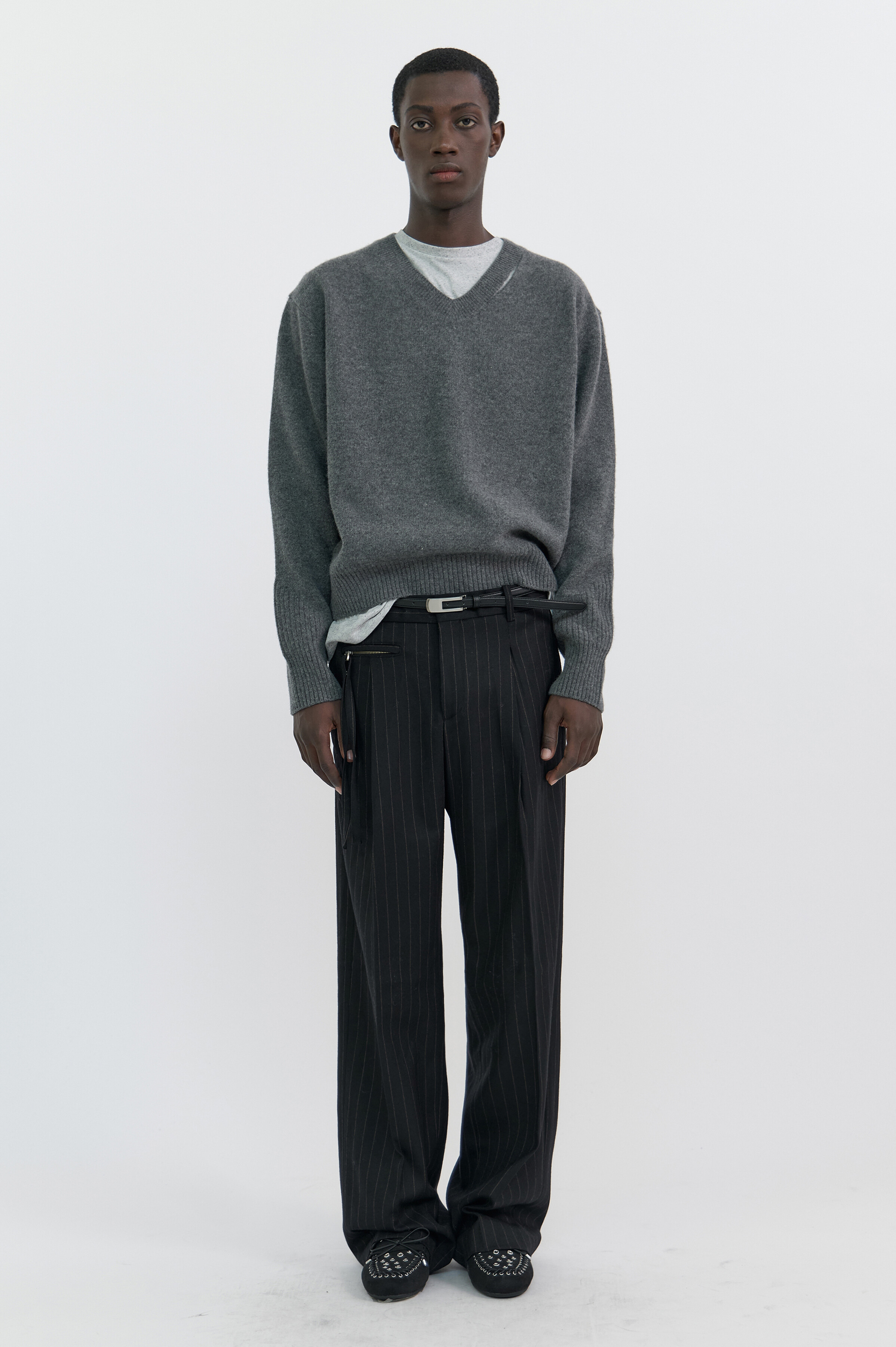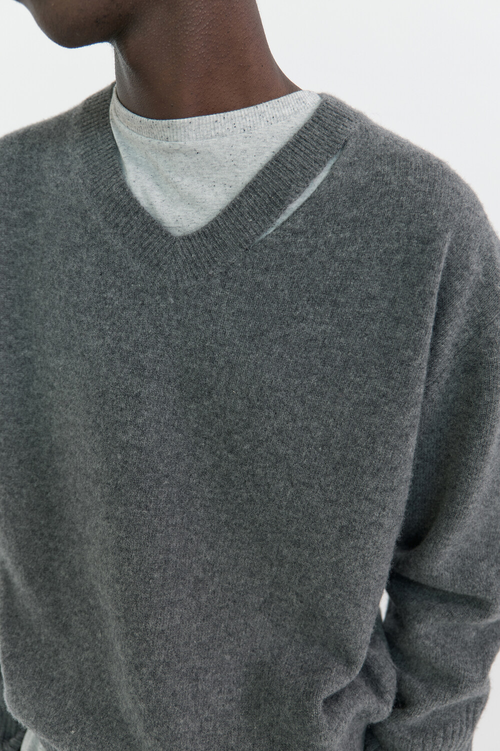 SLIT MERINO WOOL V-NECK SWEATER - MELANGE GREY