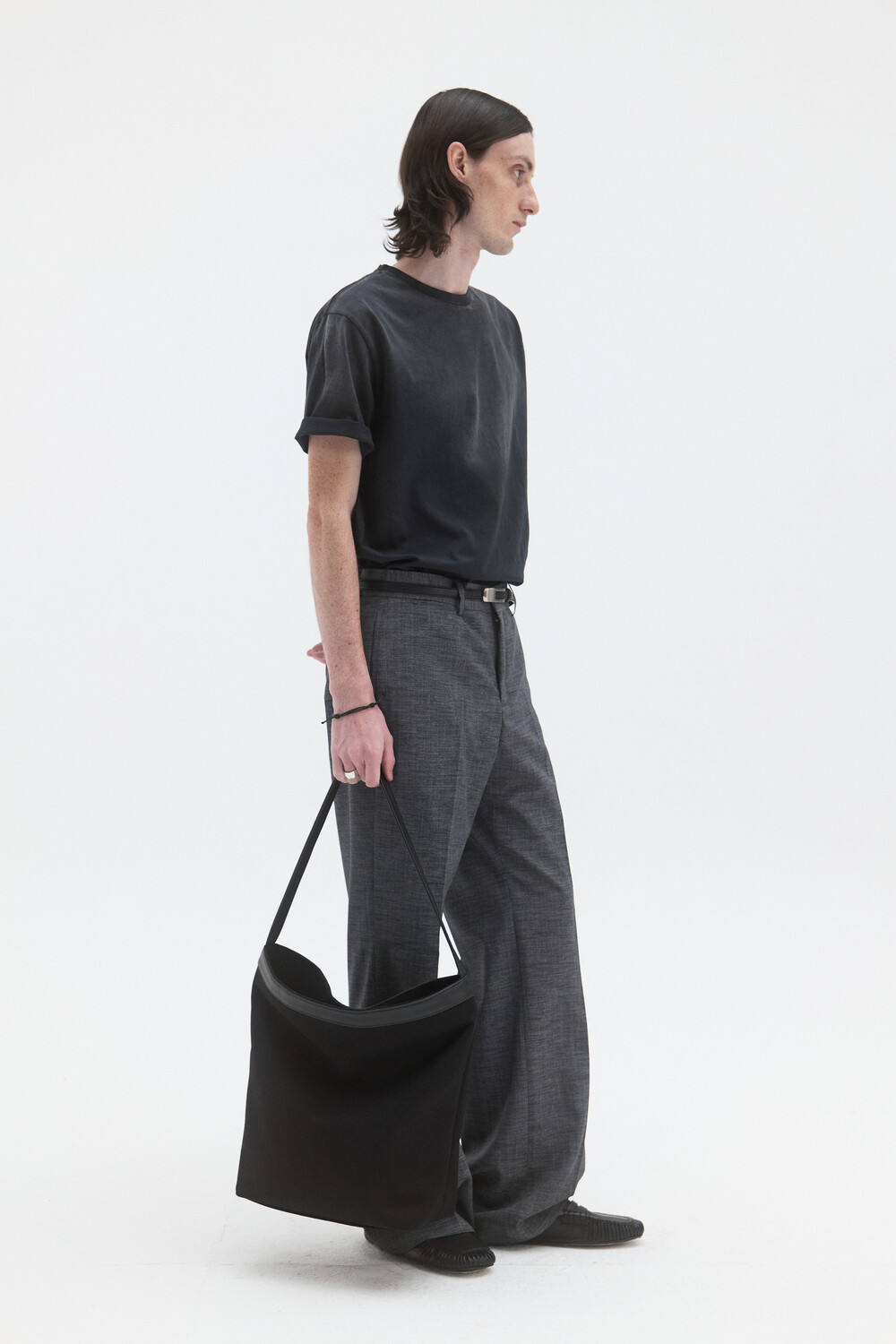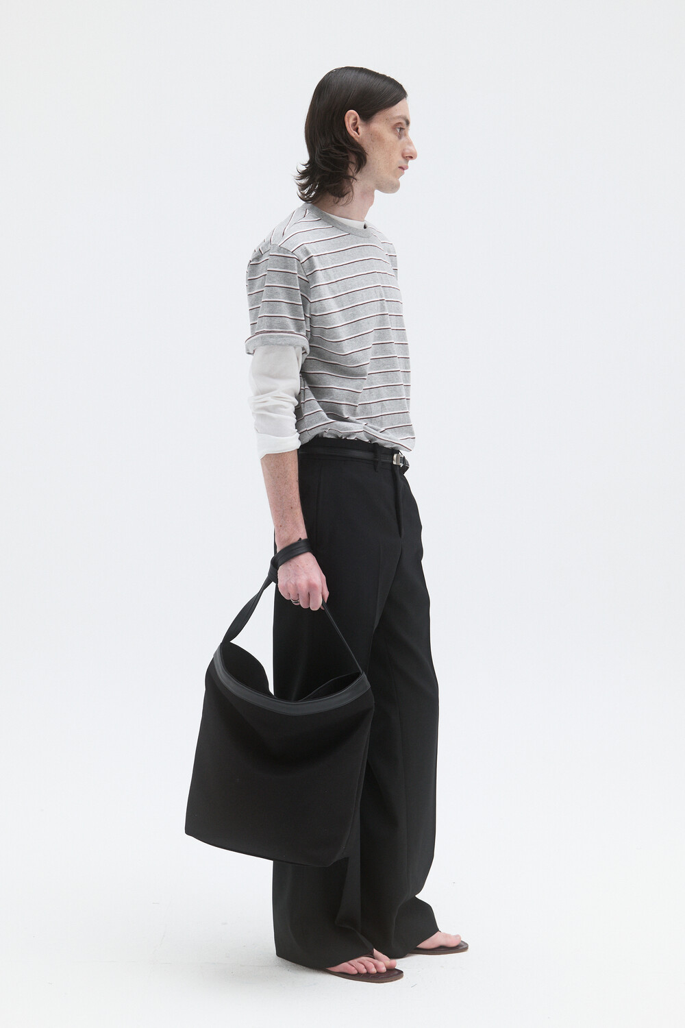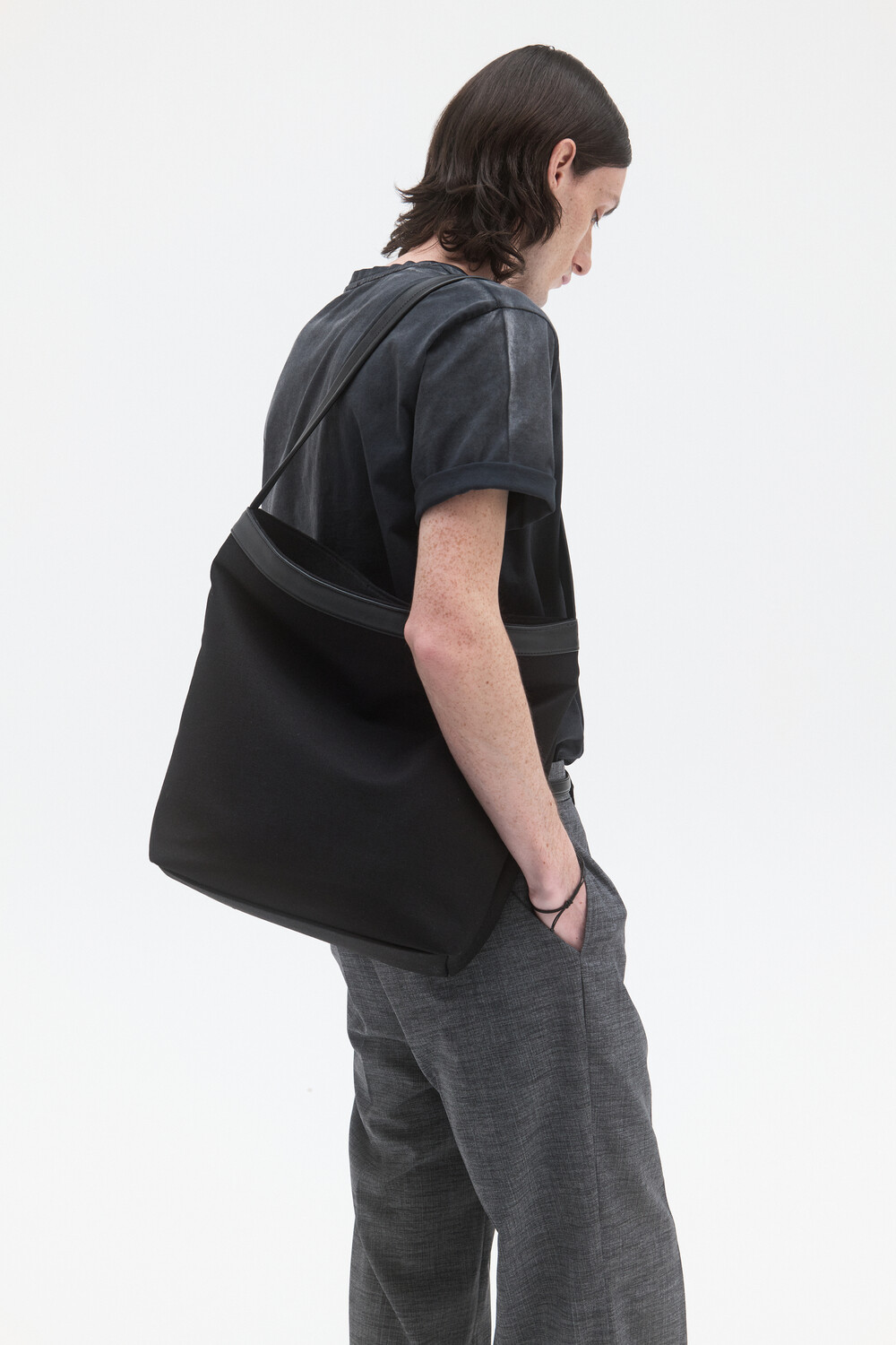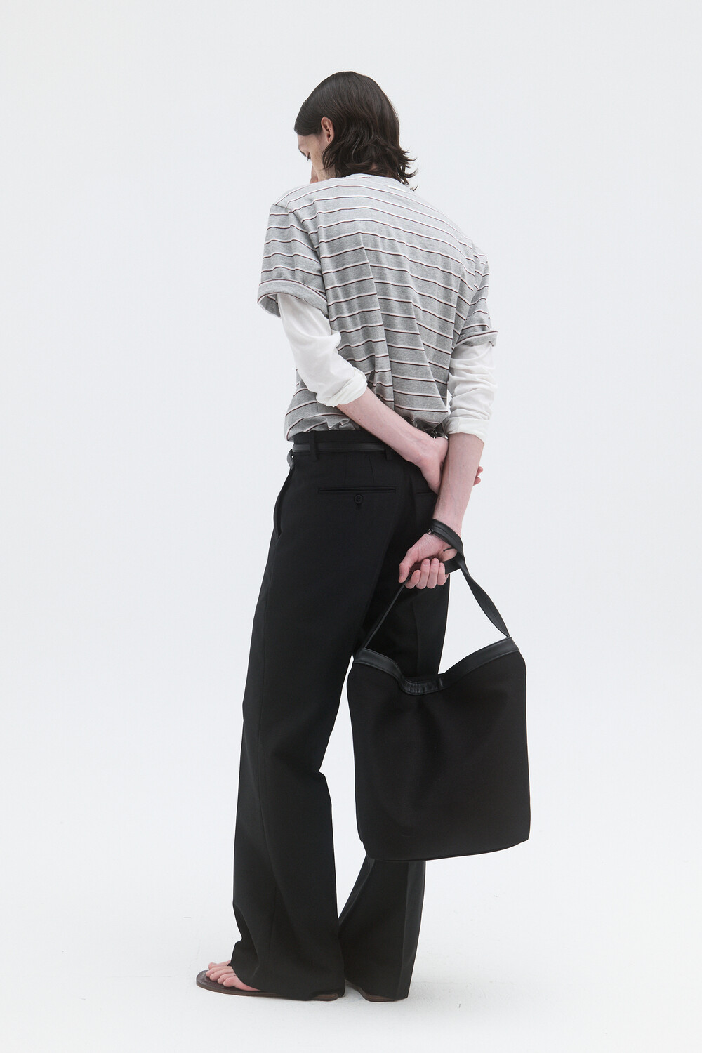 -매트한 내츄럴 타입 소가죽 트리밍과 두께감 있는 코튼 트윌소재가 믹스된 모던한 미감의 버킷백