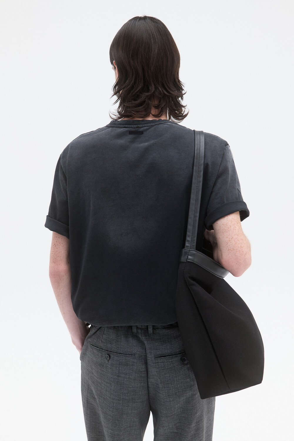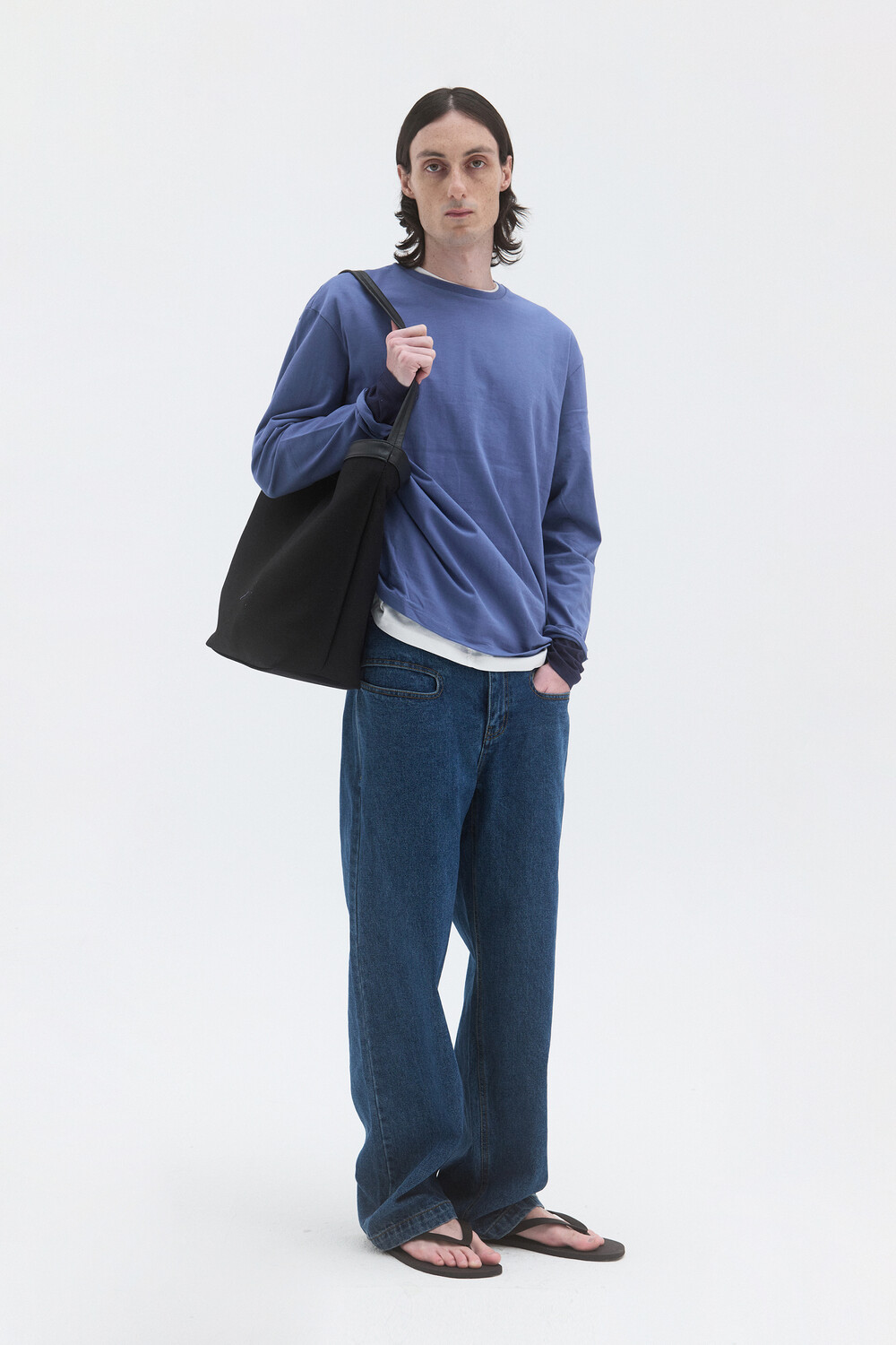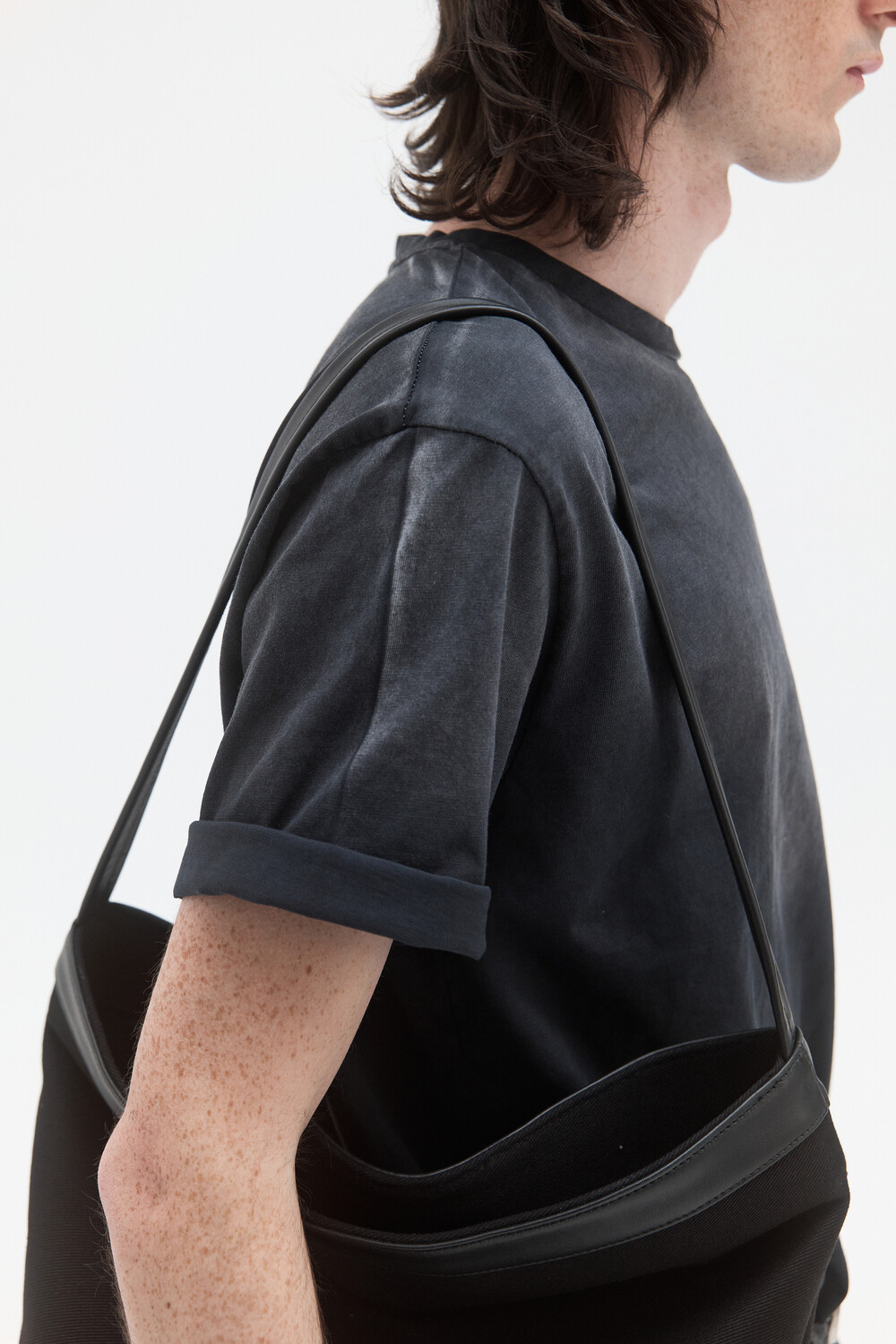 -매트한 내츄럴 타입 소가죽 트리밍과 두께감 있는 코튼 트윌소재가 믹스된 모던한 미감의 버킷백