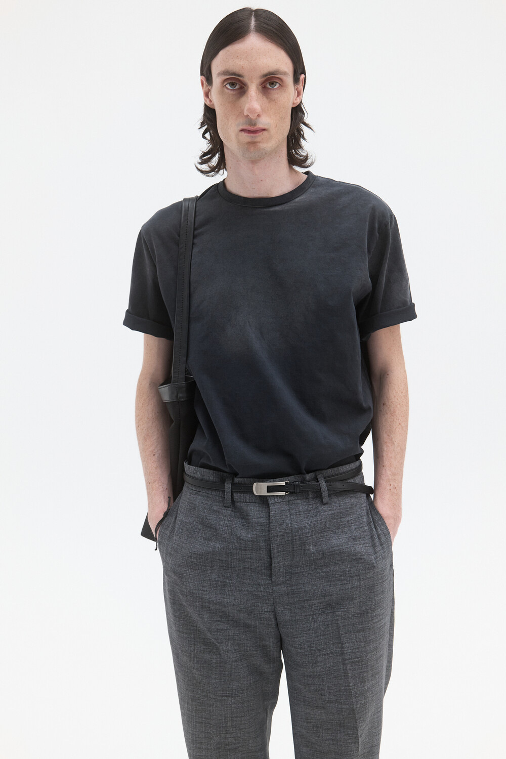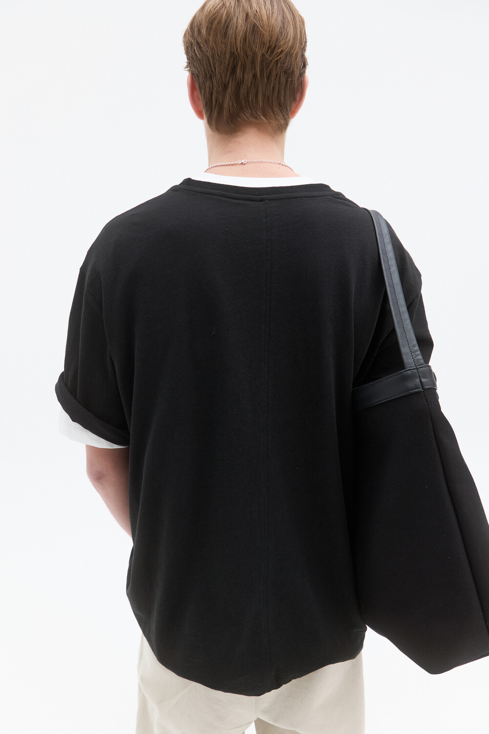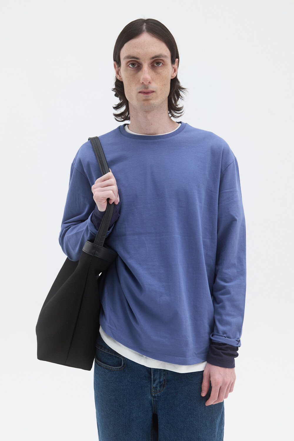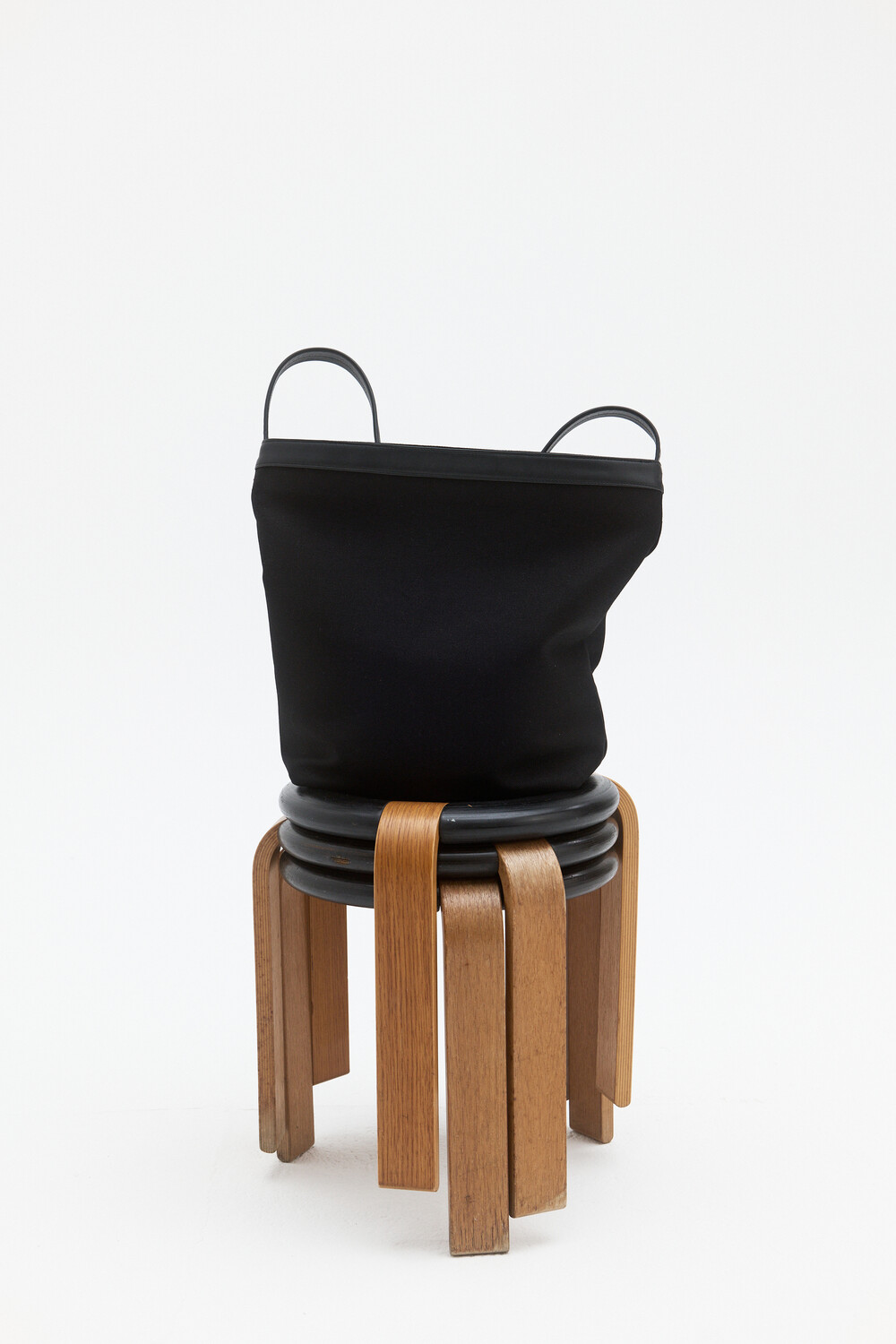 -매트한 내츄럴 타입 소가죽 트리밍과 두께감 있는 코튼 트윌소재가 믹스된 모던한 미감의 버킷백