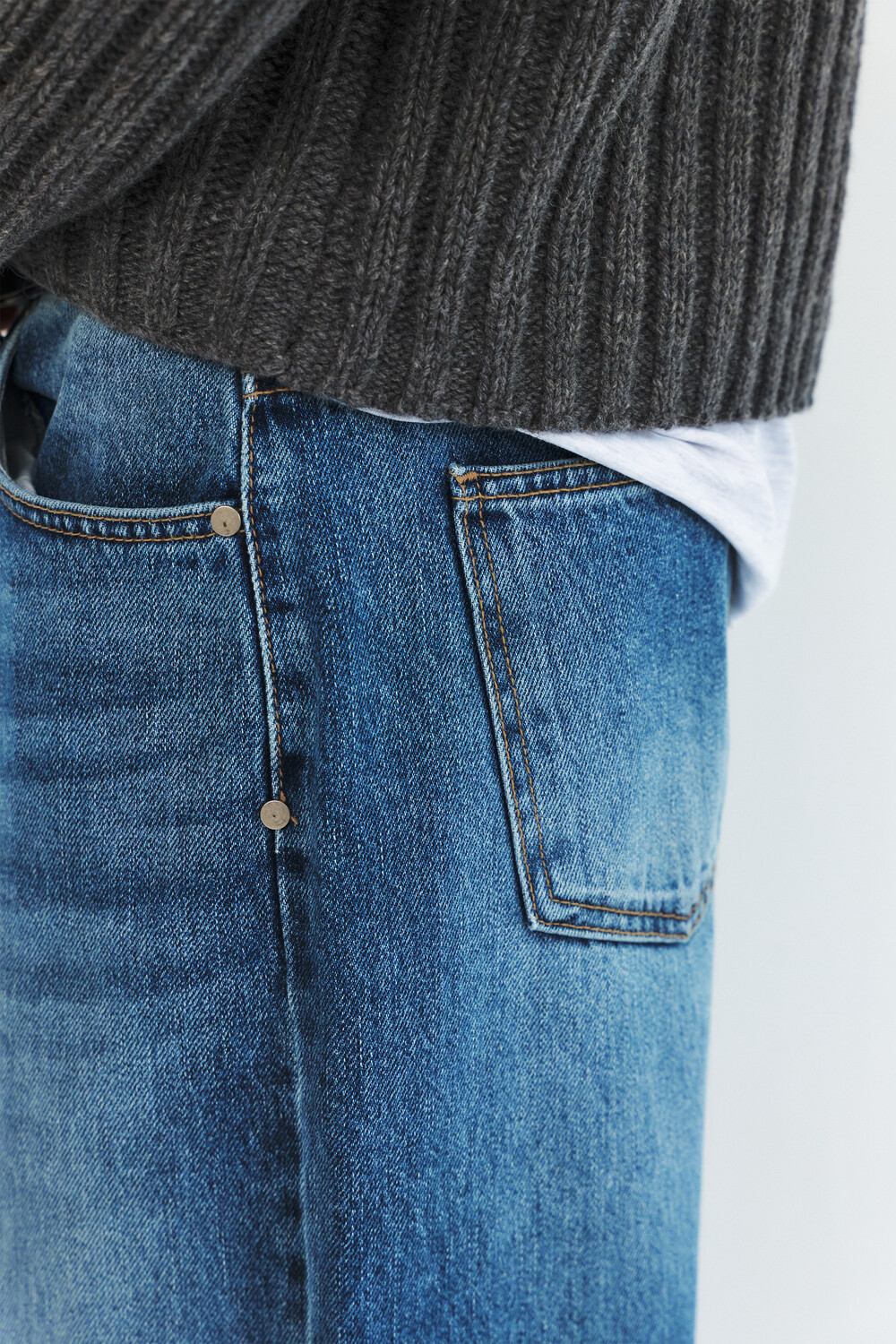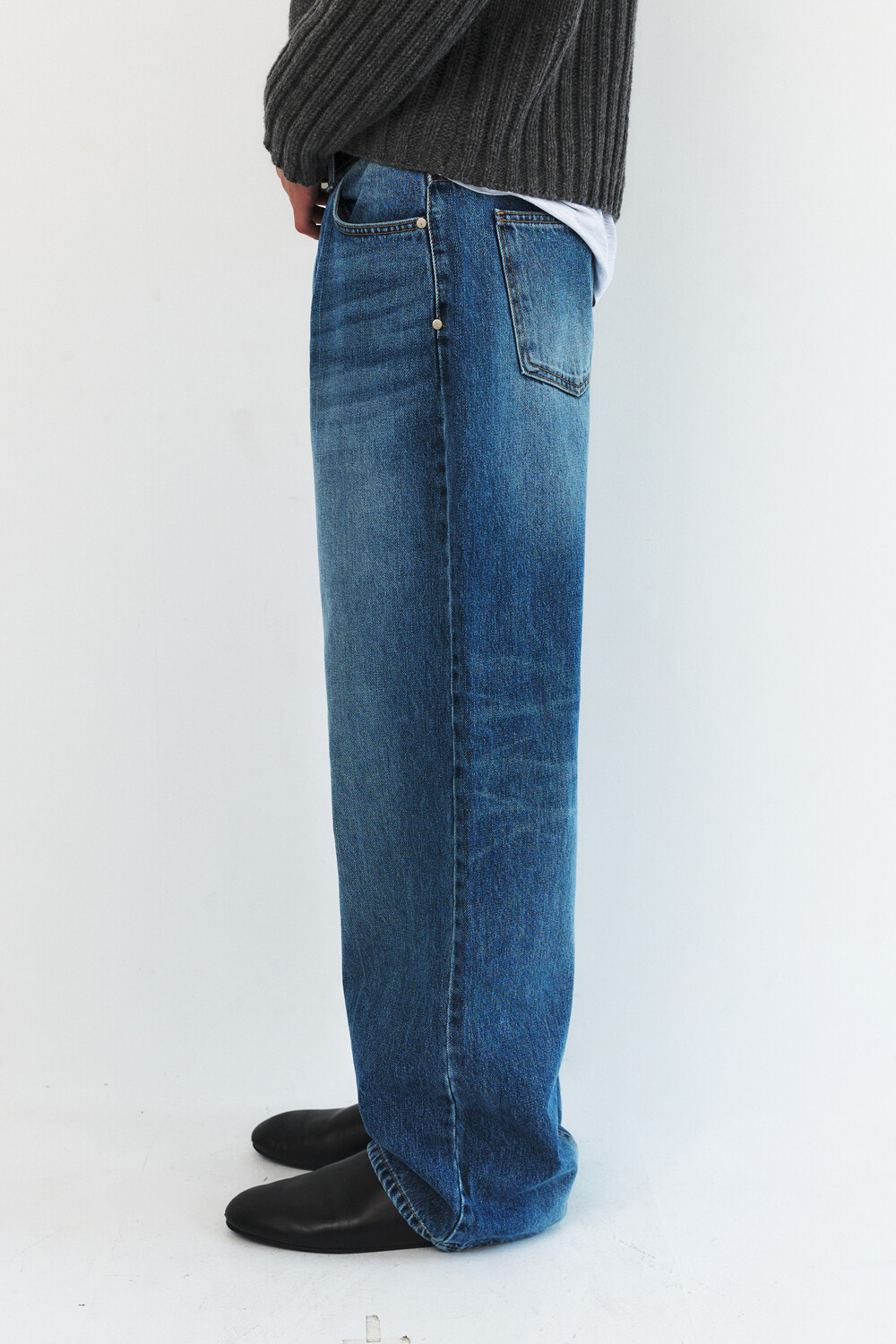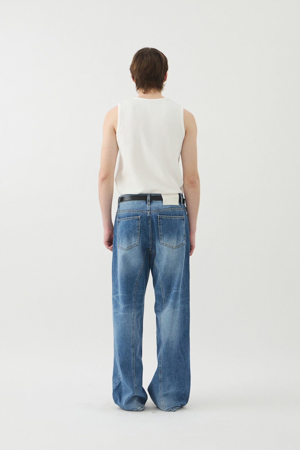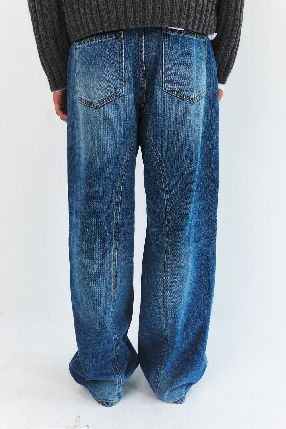 -레직기 라인의 워싱과 은은한게 노출되는 뒤쪽 절개가 특징인 데님 팬츠