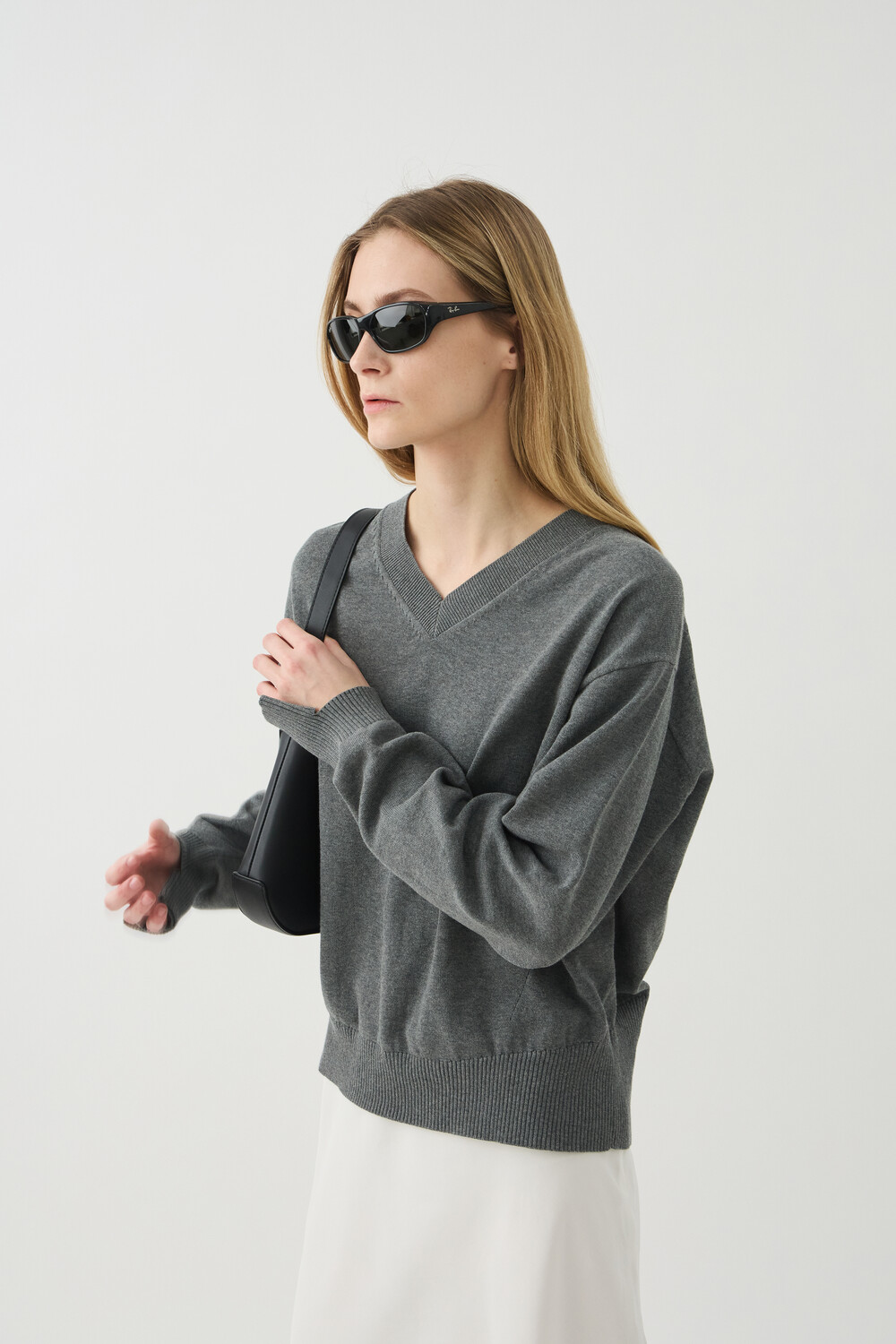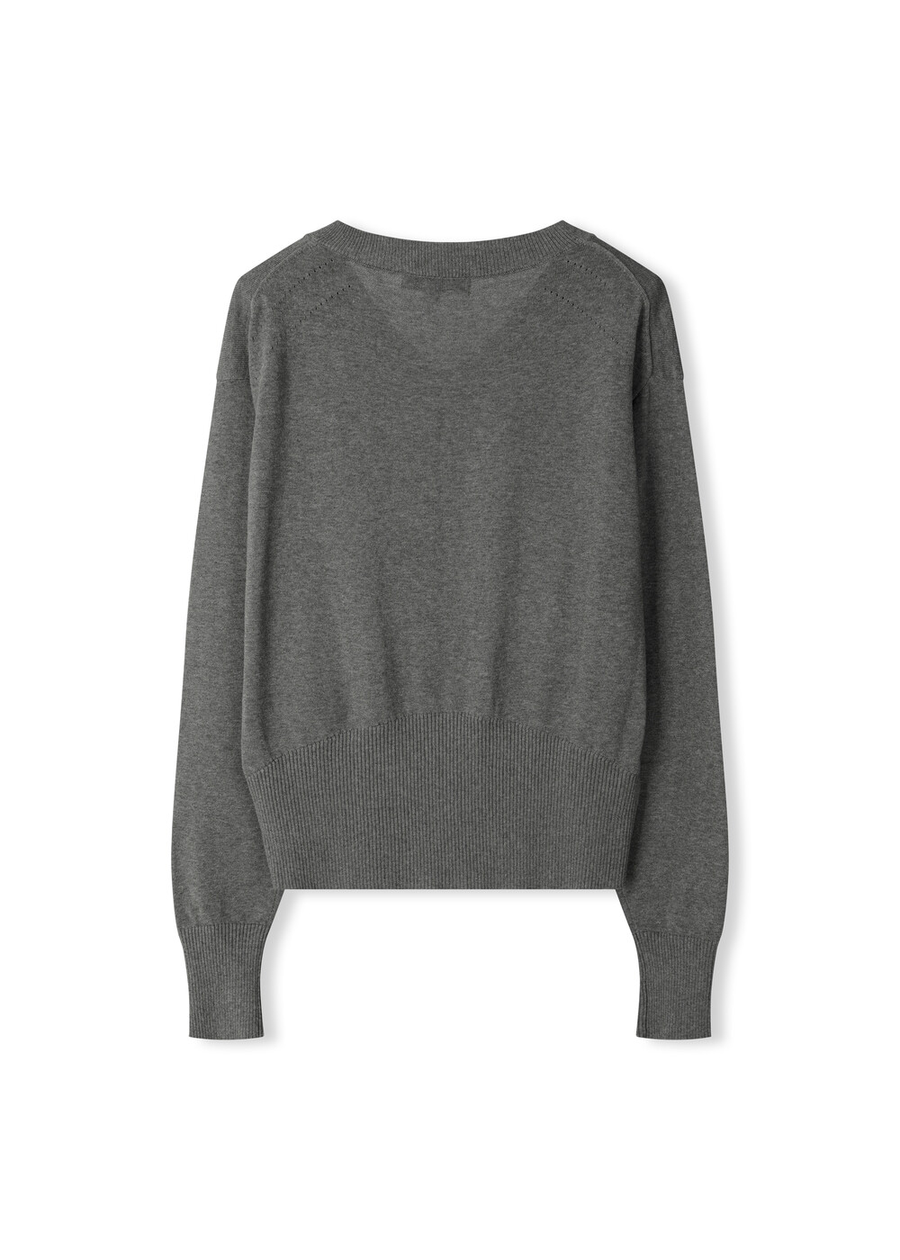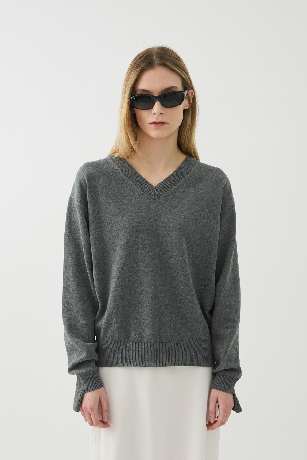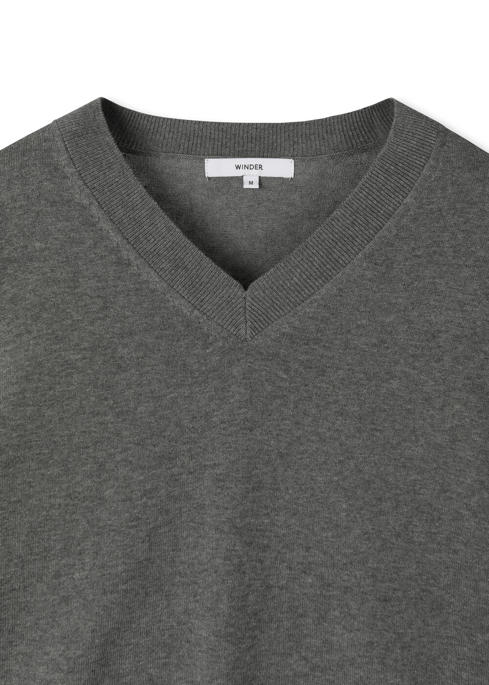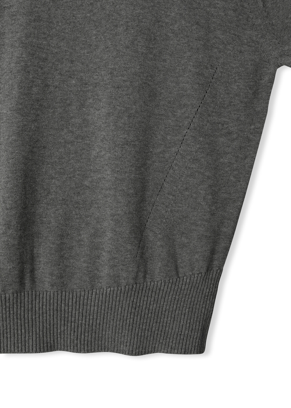 SLEEVE-CUT FINE COTTON V NECK SWEATER - MELANGE GREY (W)