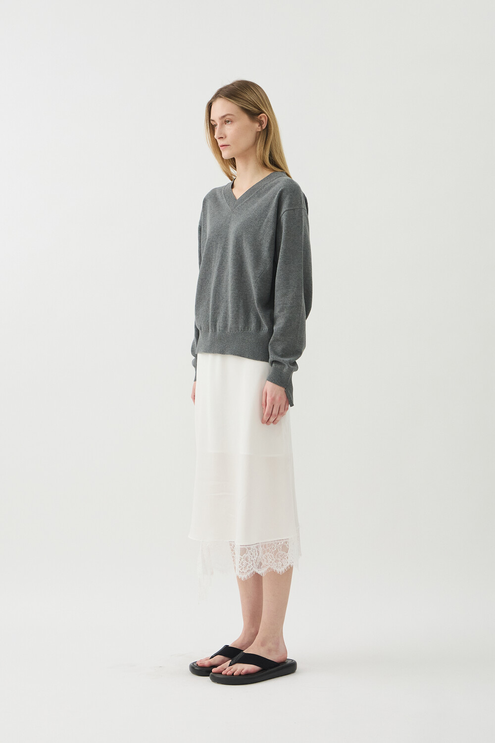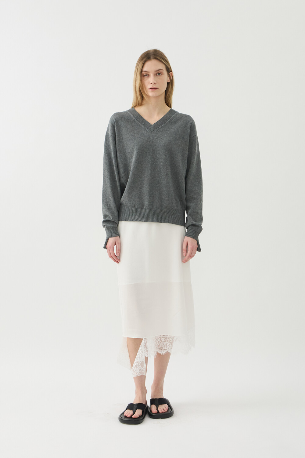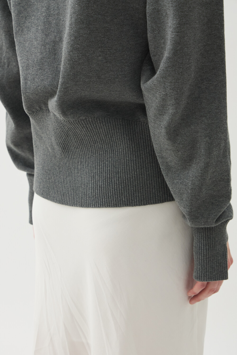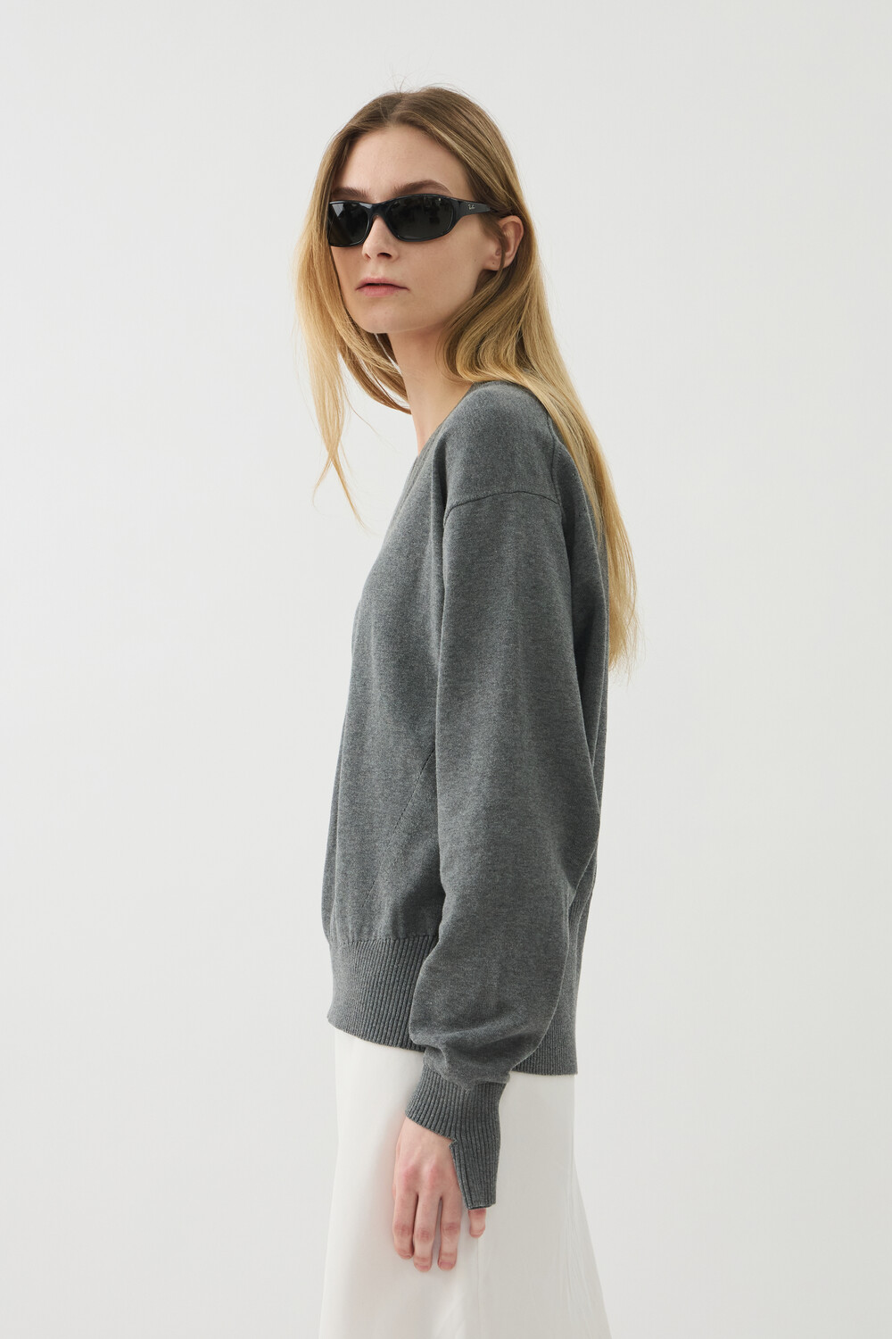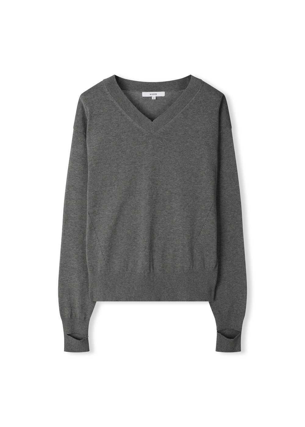 SLEEVE-CUT FINE COTTON V NECK SWEATER - MELANGE GREY (W)
