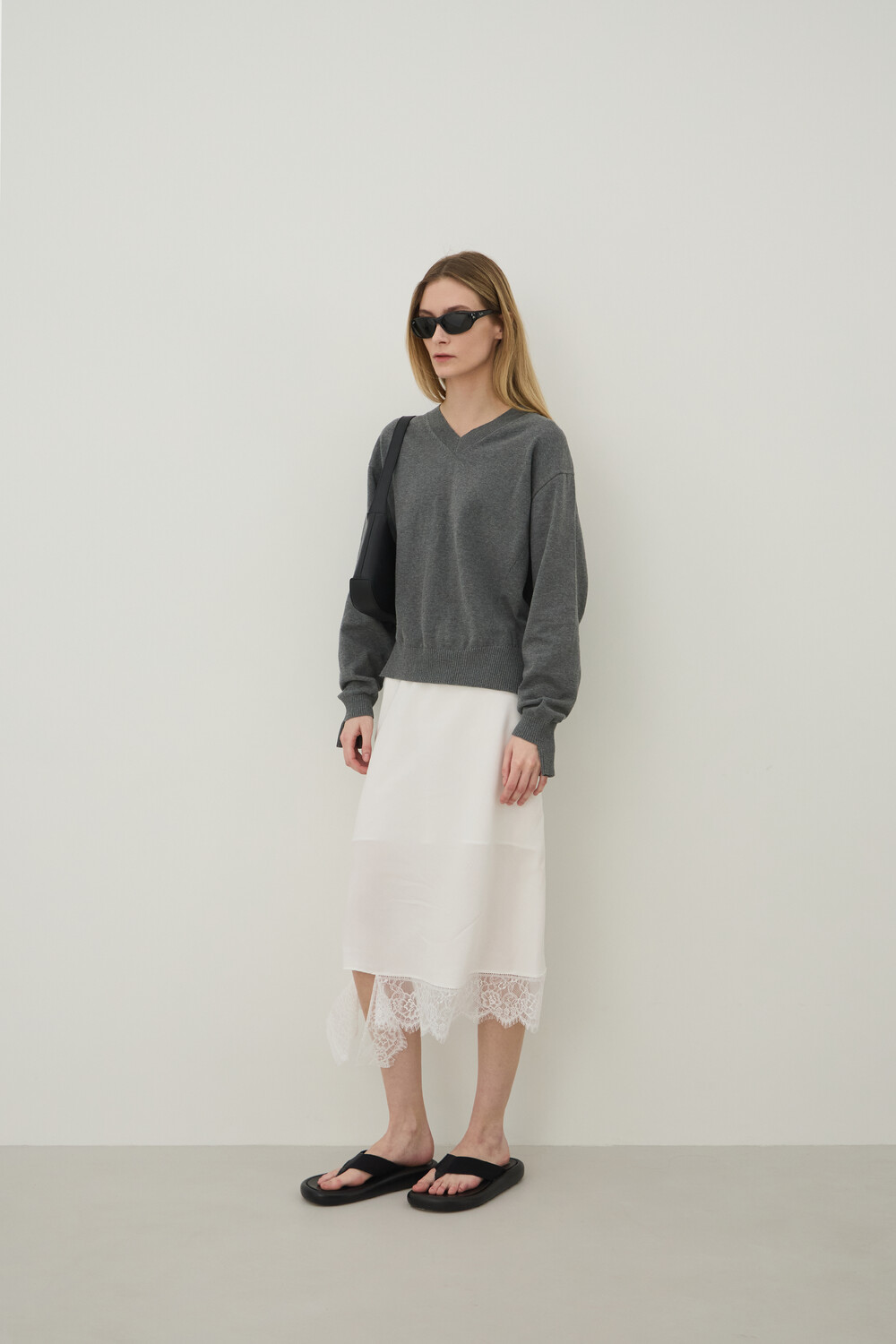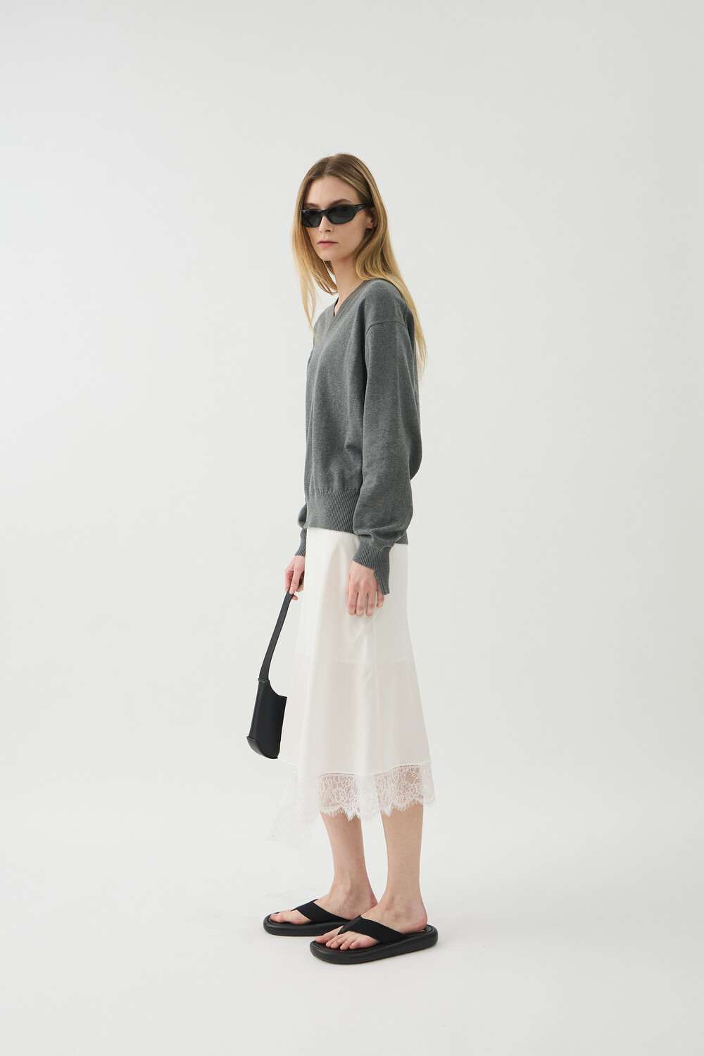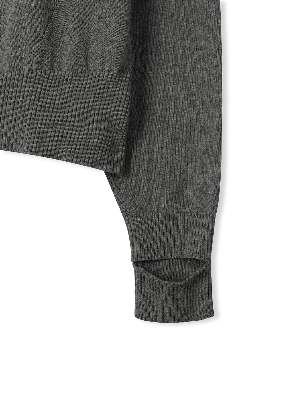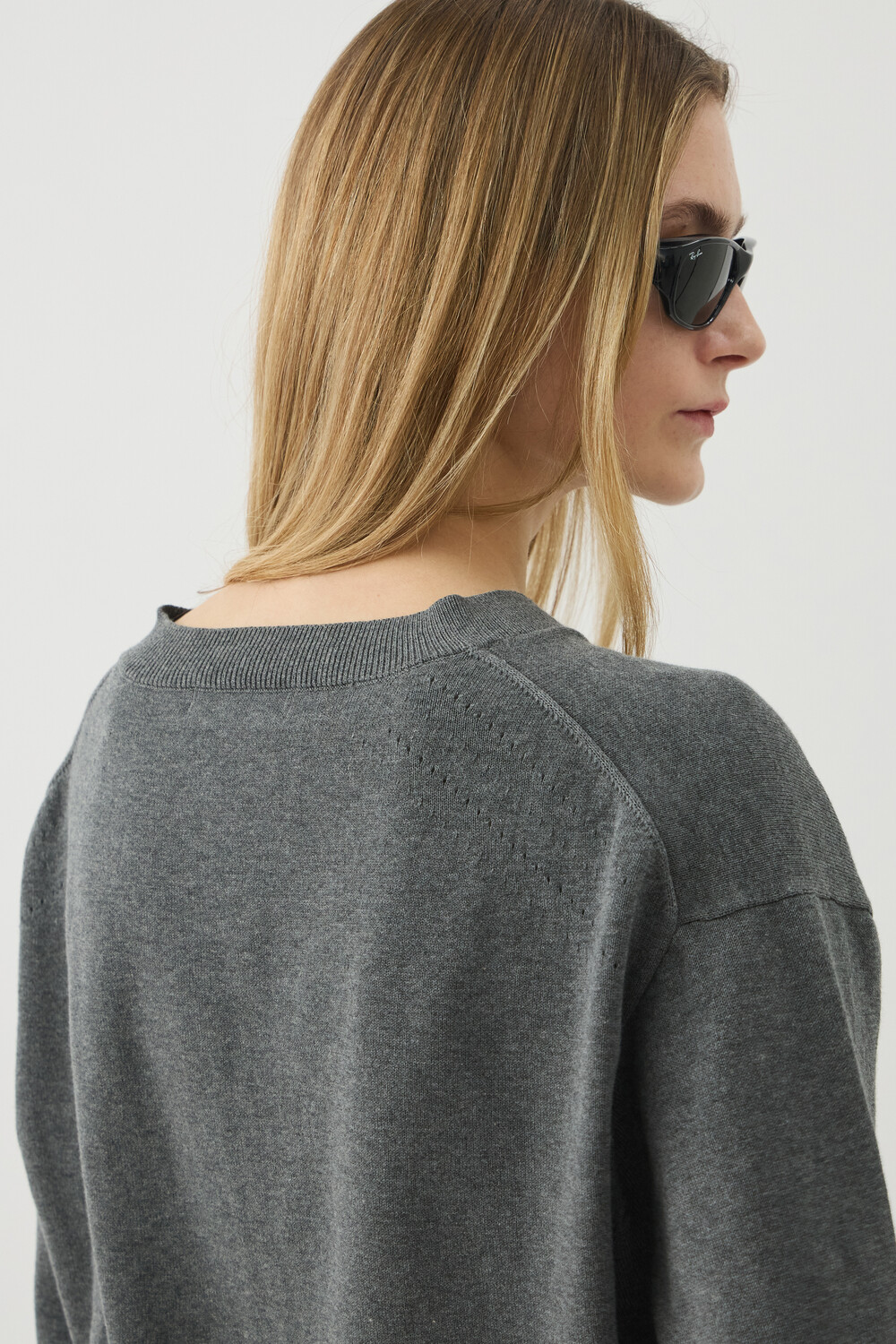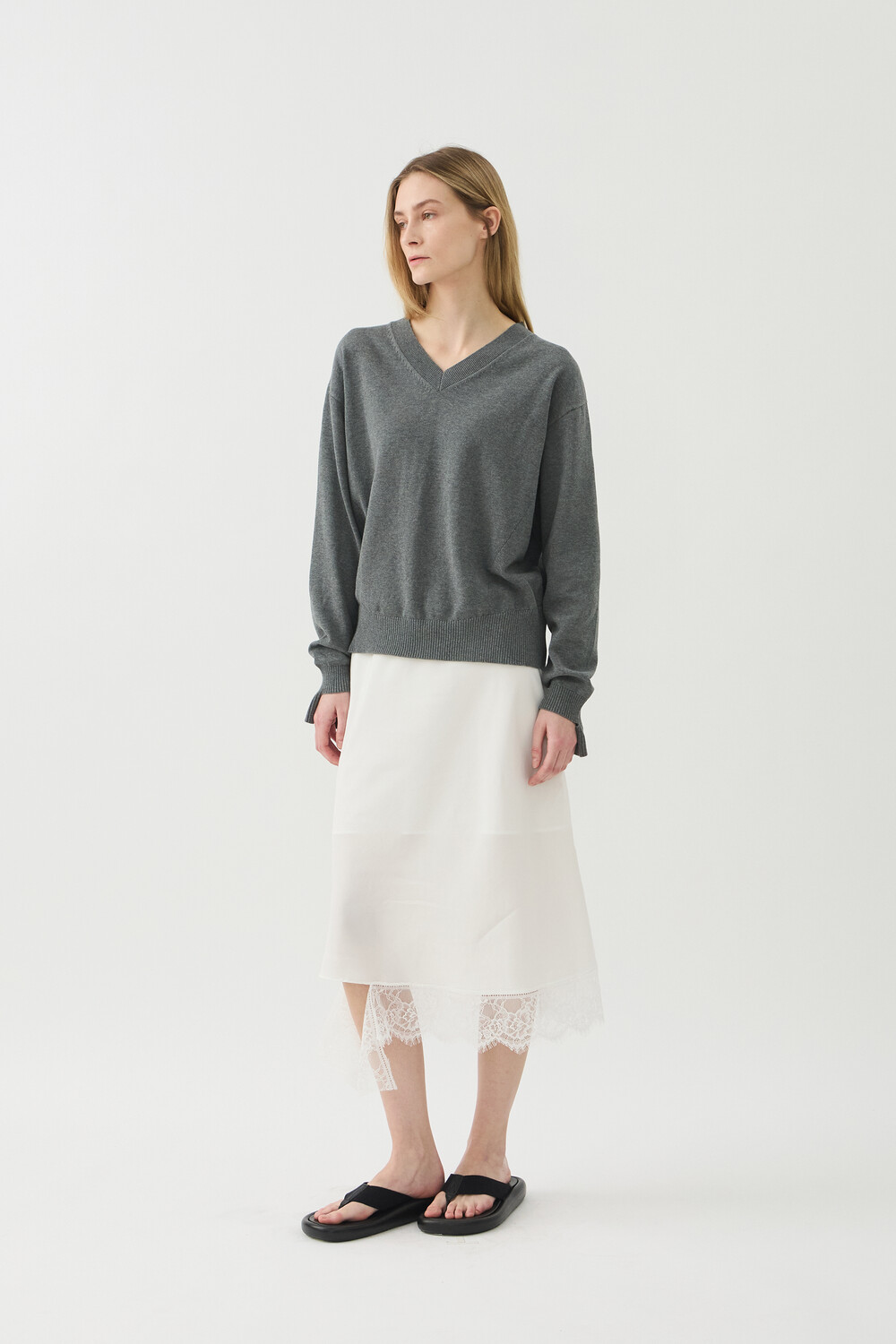 SLEEVE-CUT FINE COTTON V NECK SWEATER - MELANGE GREY (W)