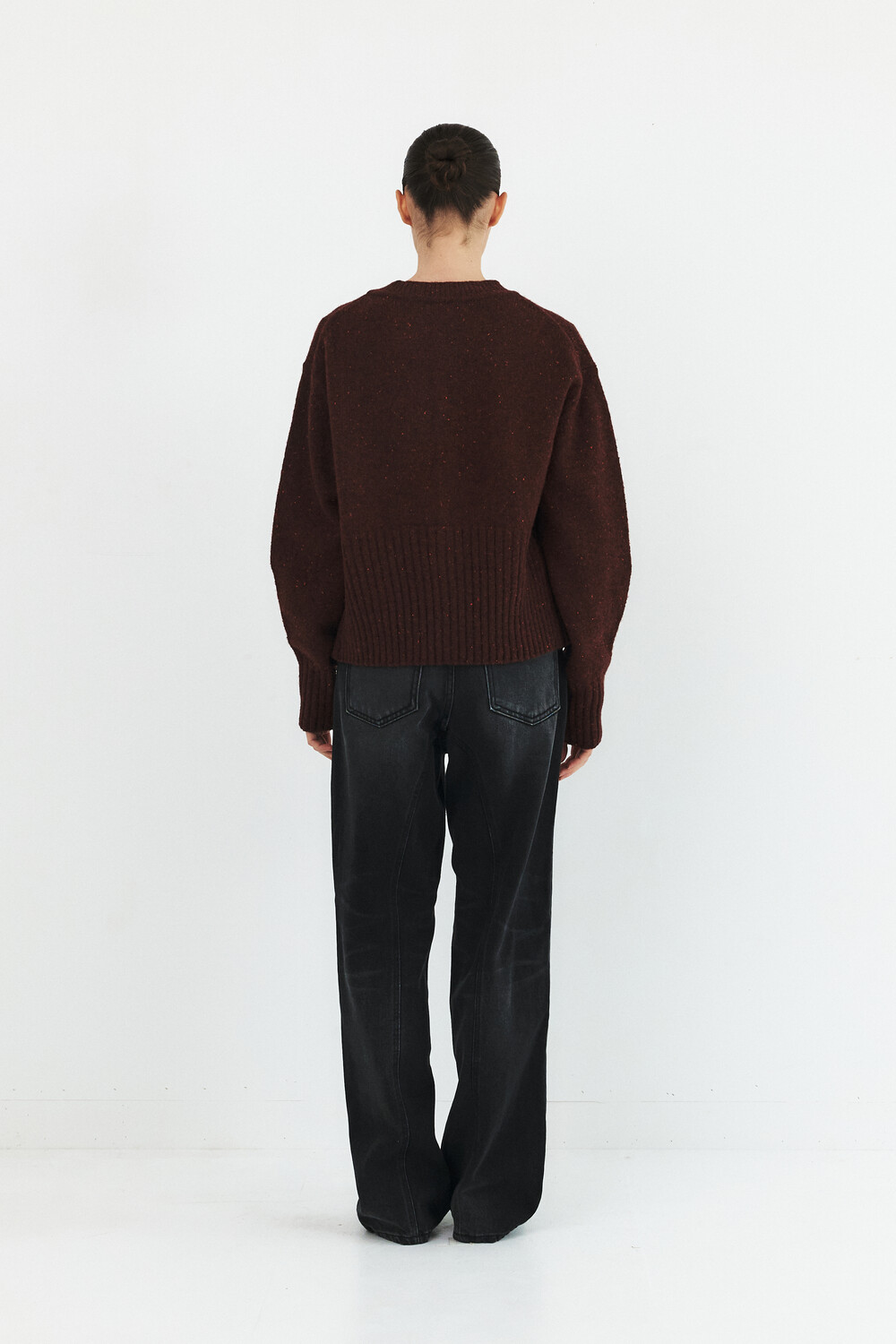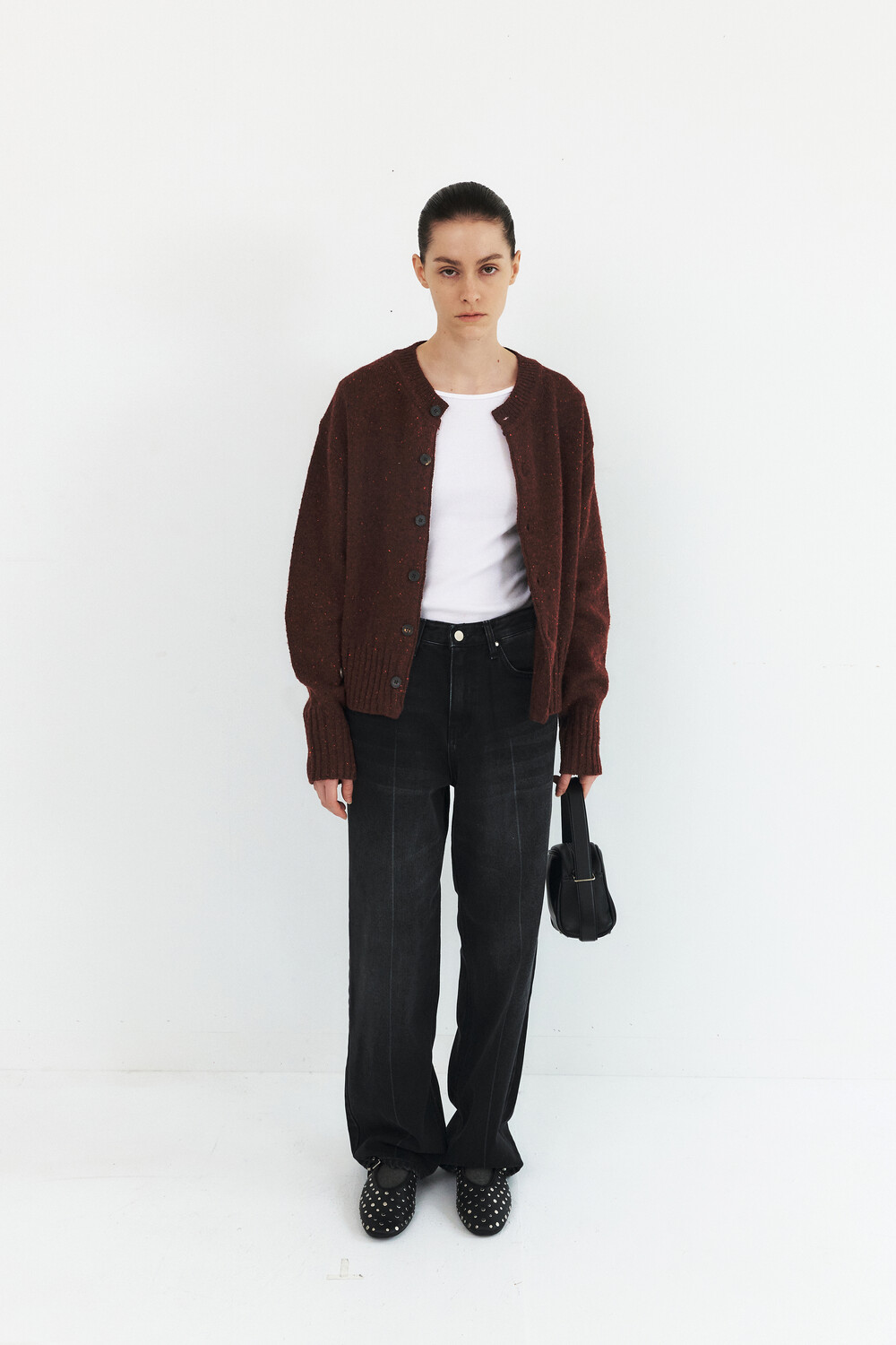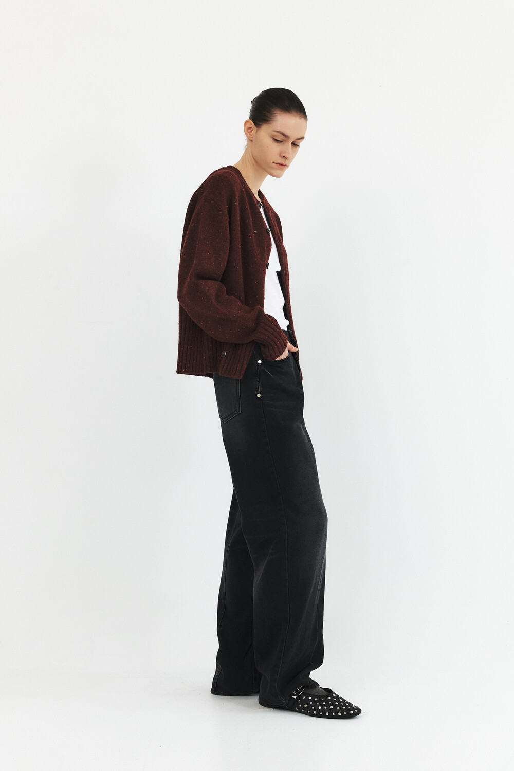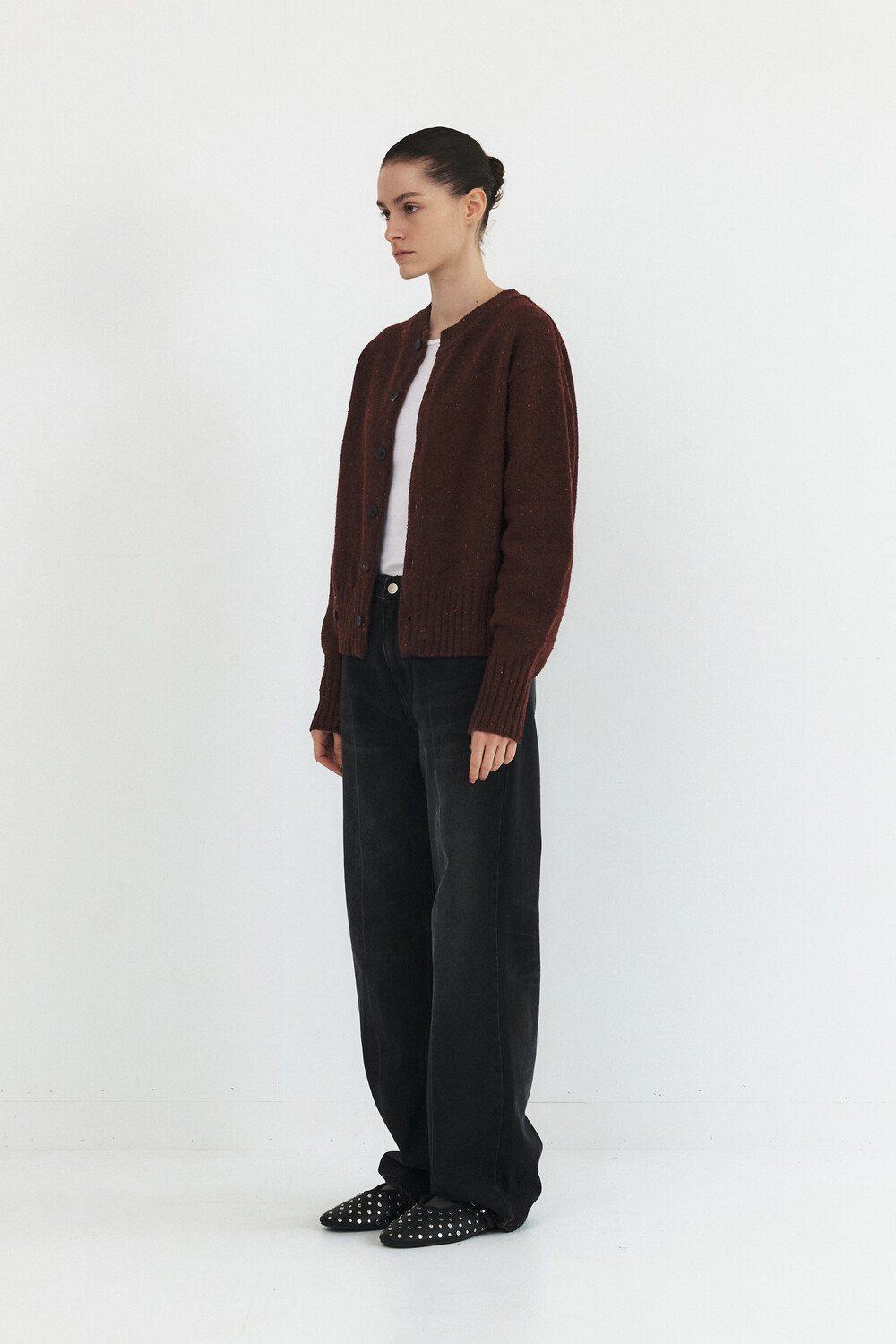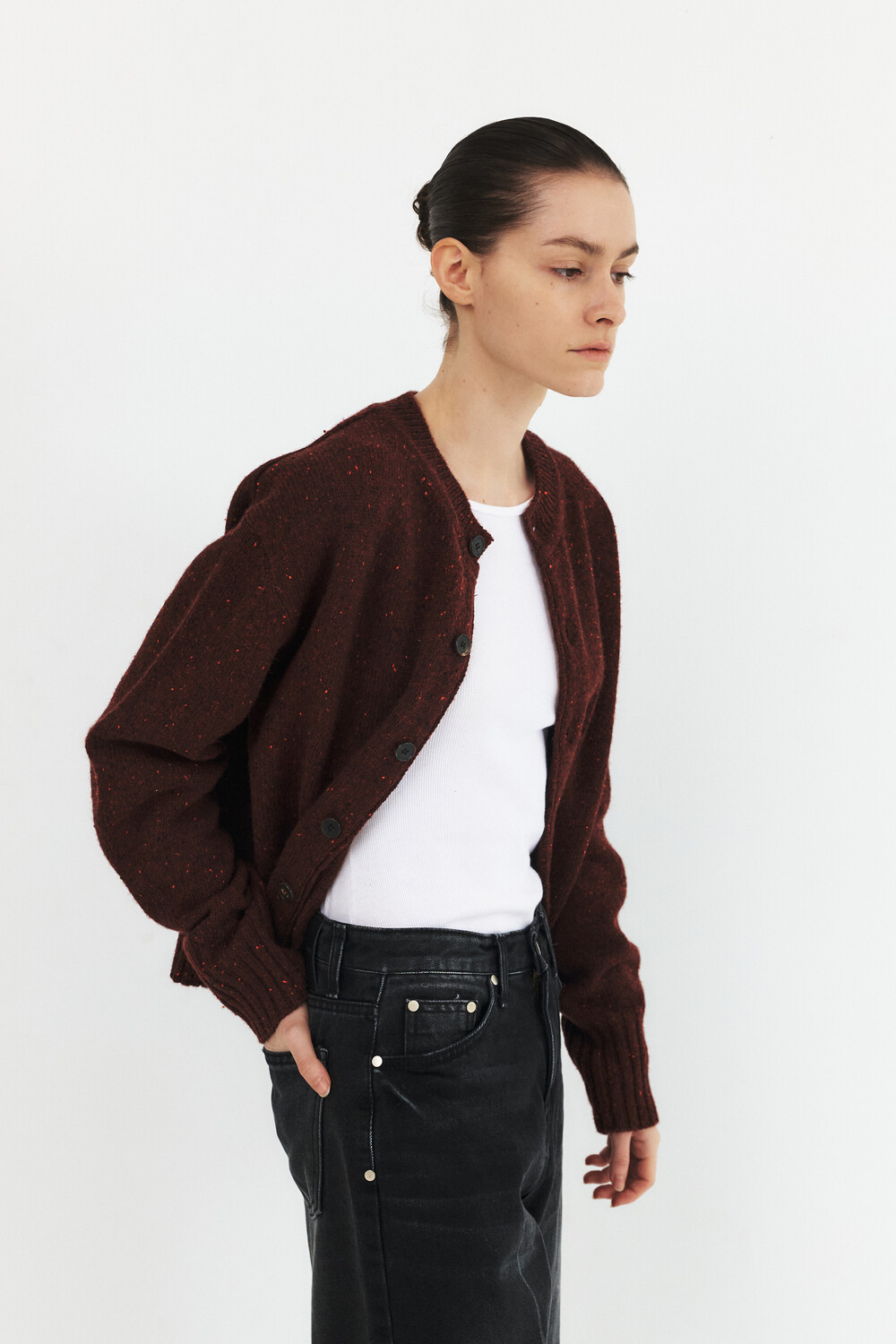 -볼륨소매와 변형된 몸판 립 디자인의 라운드넥 가디건